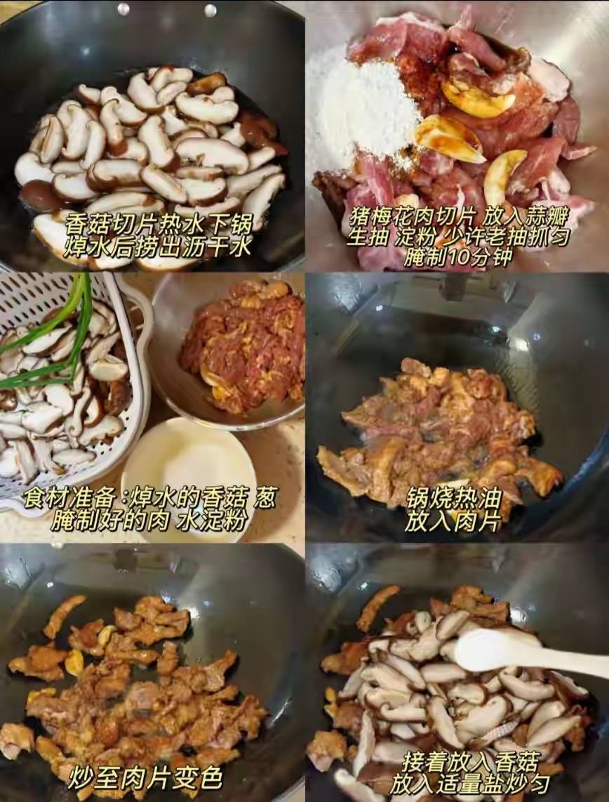 瘦肉切薄片,加一勺生抽、半勺淀粉抓匀,再淋点油锁住水分,腌10分钟。香菇切片,青椒切块。