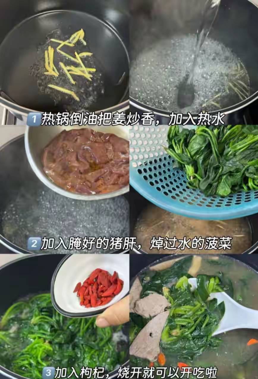 锅里烧两碗水,水开后放姜丝、枸杞。把猪肝一片片下进去,煮到变色就熟,别煮老了。然后放焯好的菠菜,加盐调味,关火后淋几滴香油。