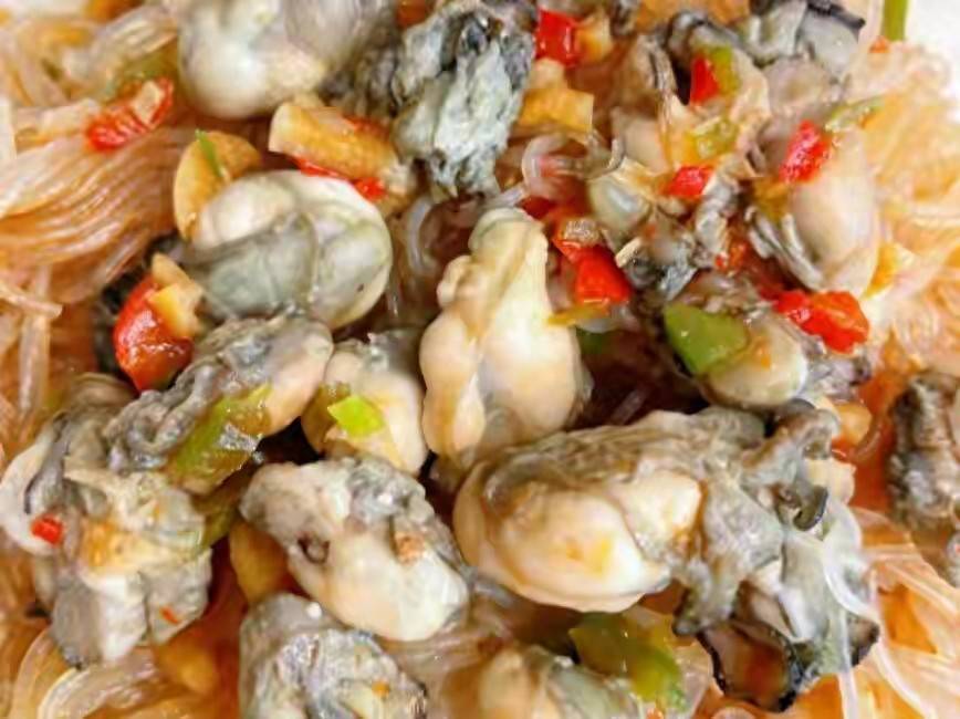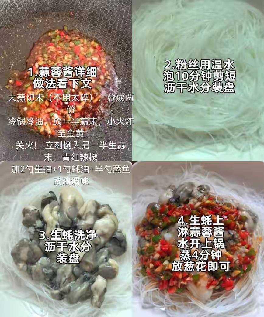 粉丝用温水泡软,剪成几段,铺在盘底。生蚝撬开,肉取出来洗干净,壳留几个做容器。把生蚝肉摆在粉丝上,或者放回壳里再放粉丝上都行。
