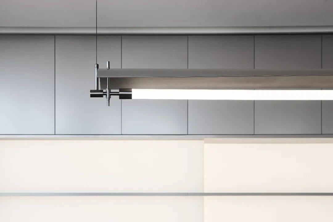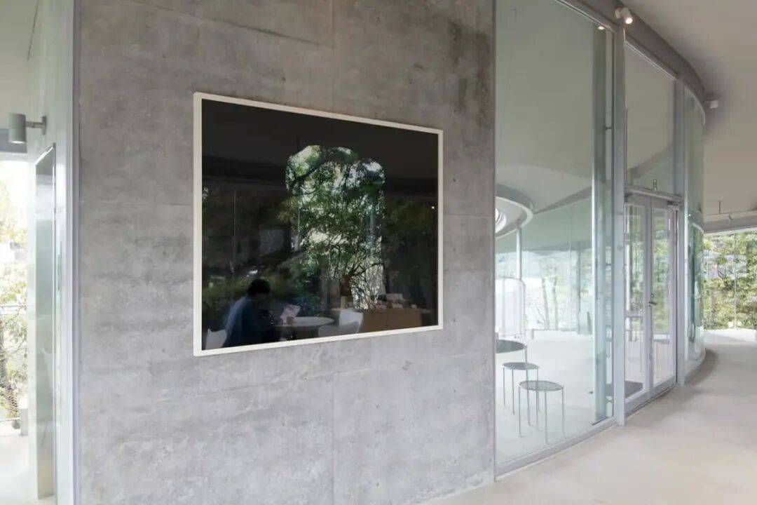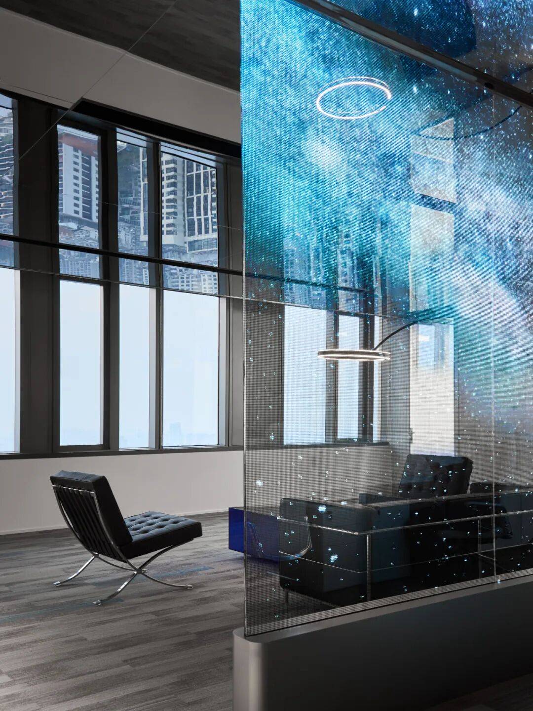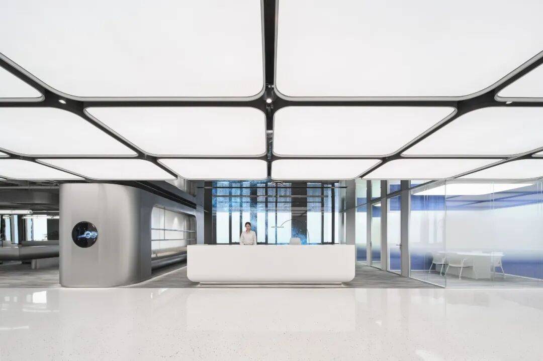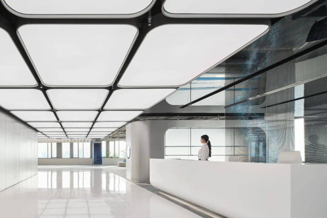 接待台后设光电玻璃,兼具屏幕功能与城市视野通透性;