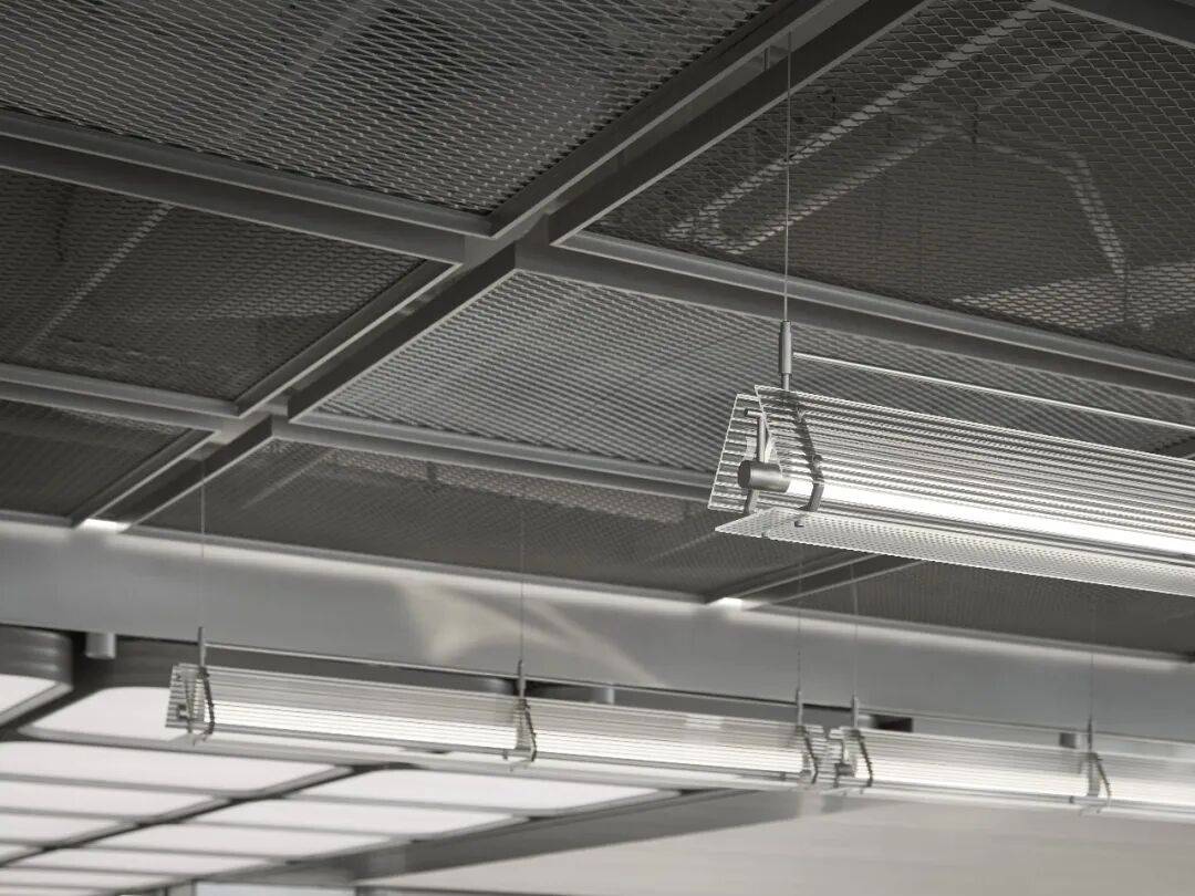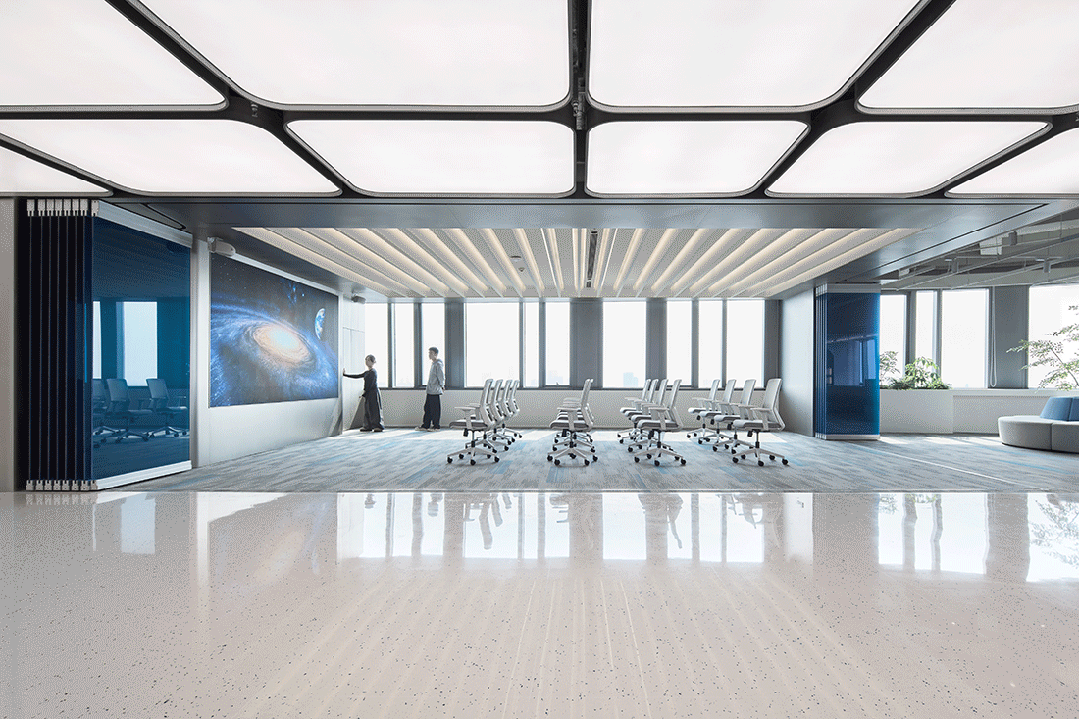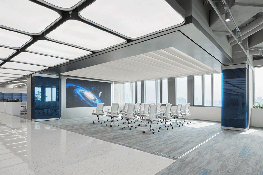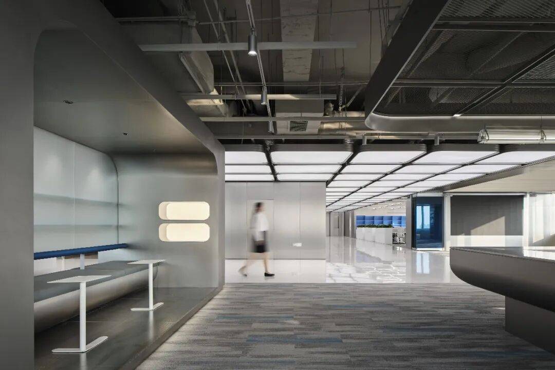 采用金属网天花弱化压迫感,搭配可调光灯带增强科技氛围;