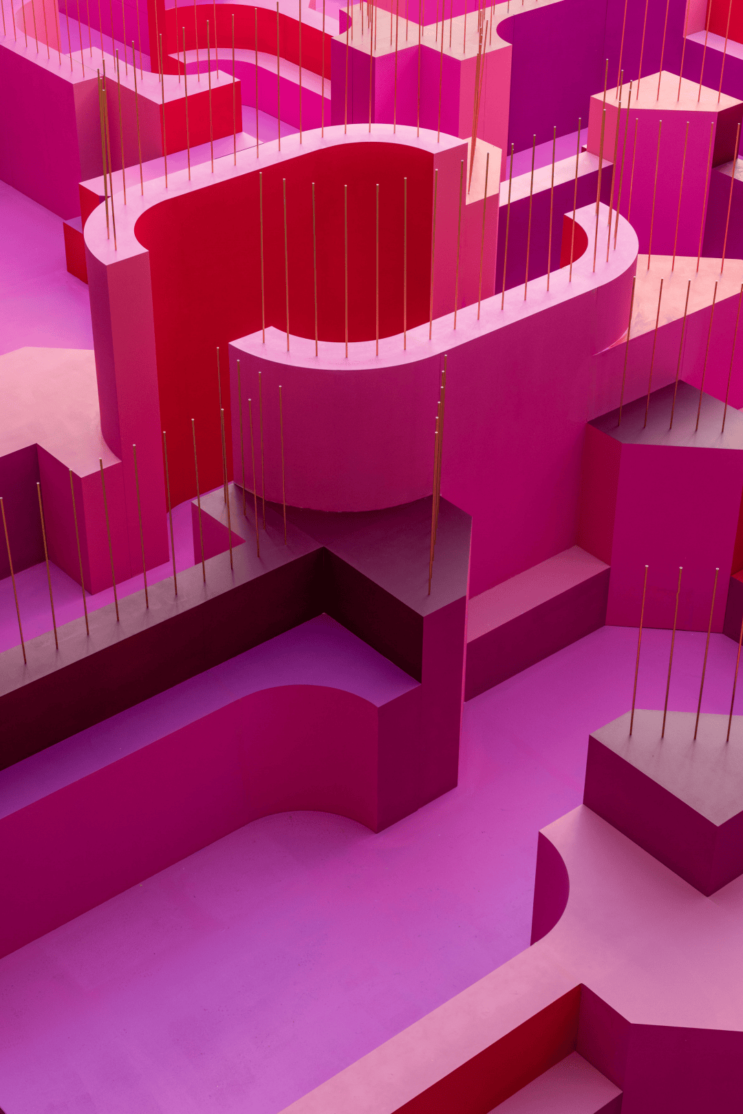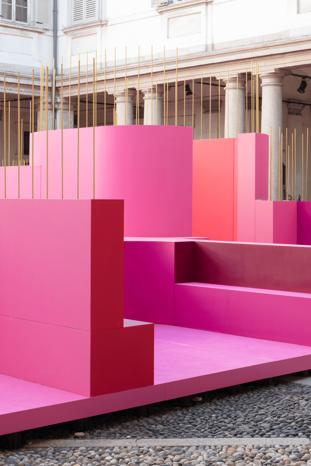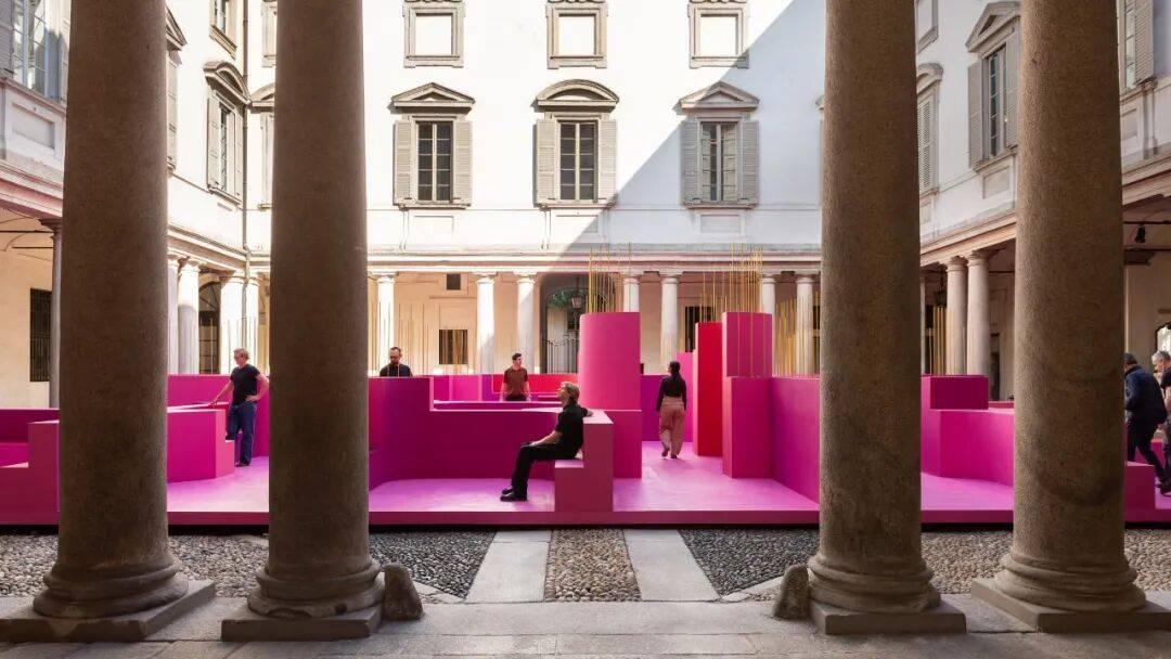 这是黎巴嫩建筑师 Lina Ghotmeh 在米兰 Palazzo Litta 巴洛克庭院,打造的个人户外作品装置 Metamorphosis in Motion,装置以粉色弧形木质模块构建沉浸式迷宫,呼应庭院原有几何秩序,致敬古典建筑遗产。