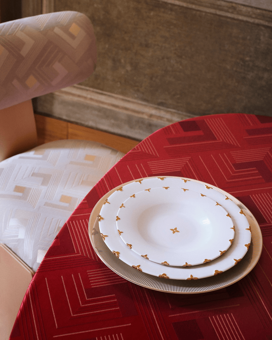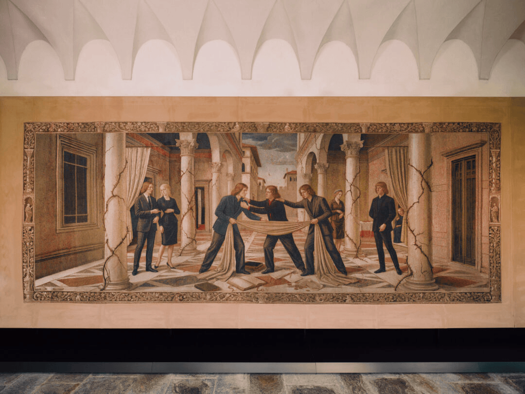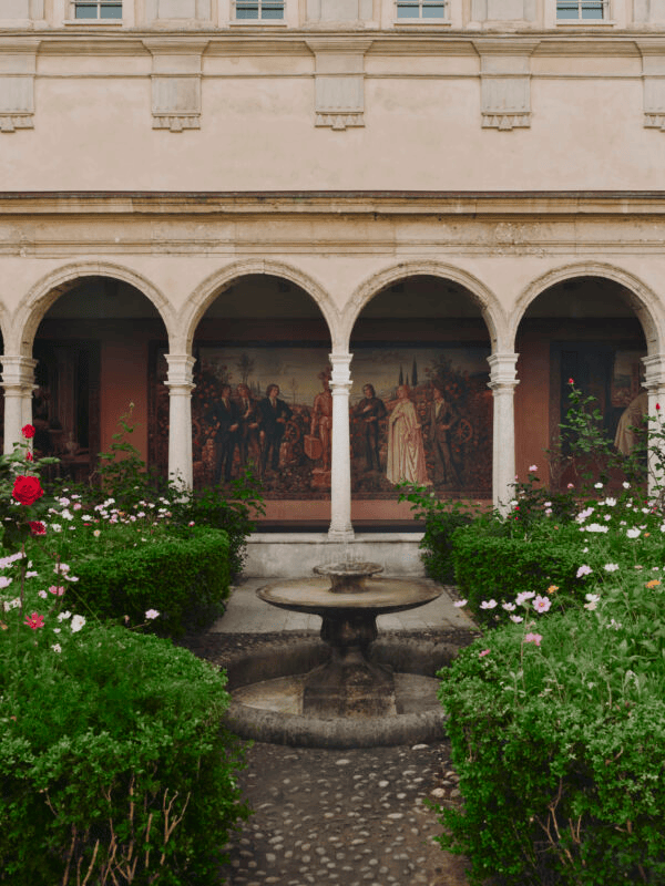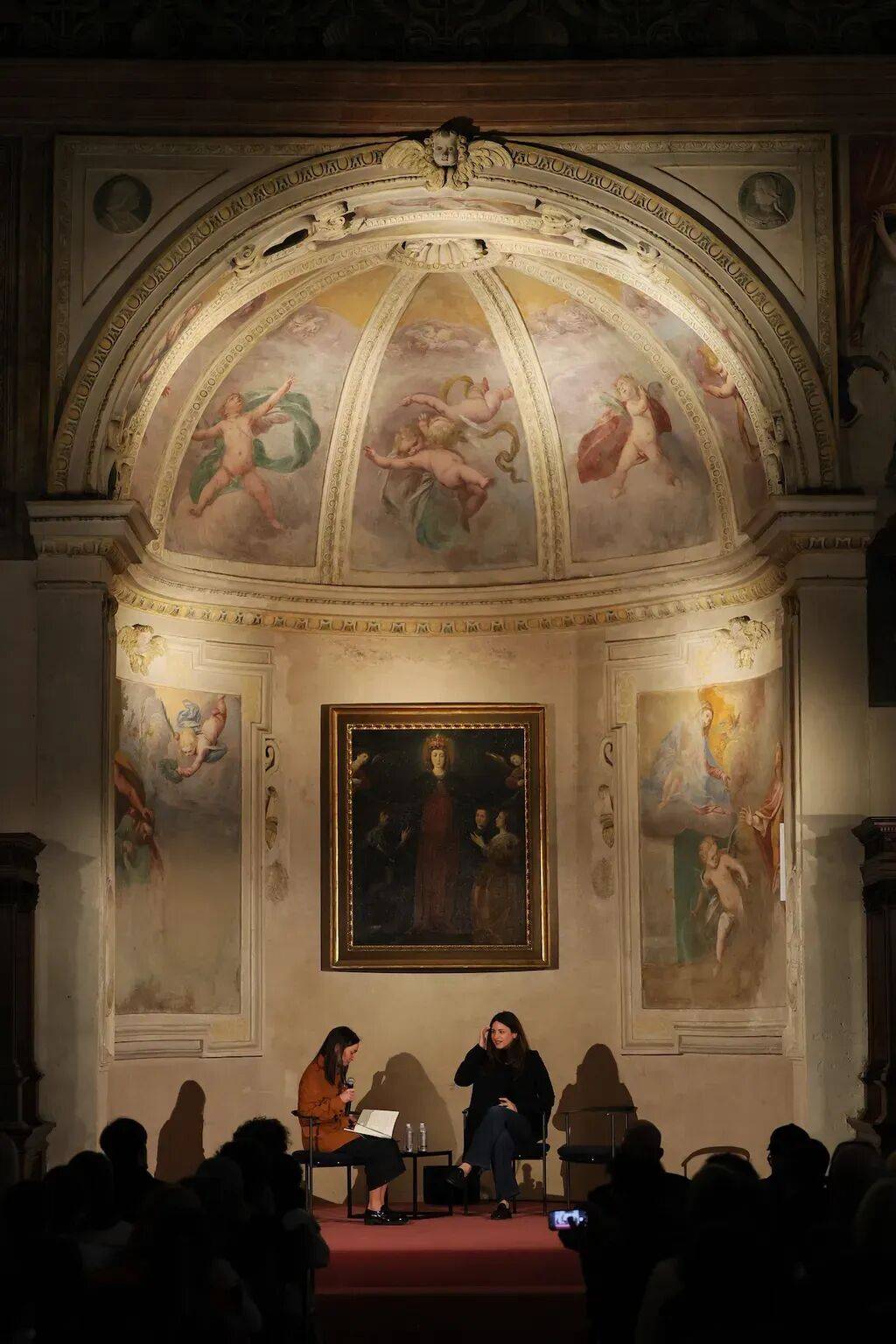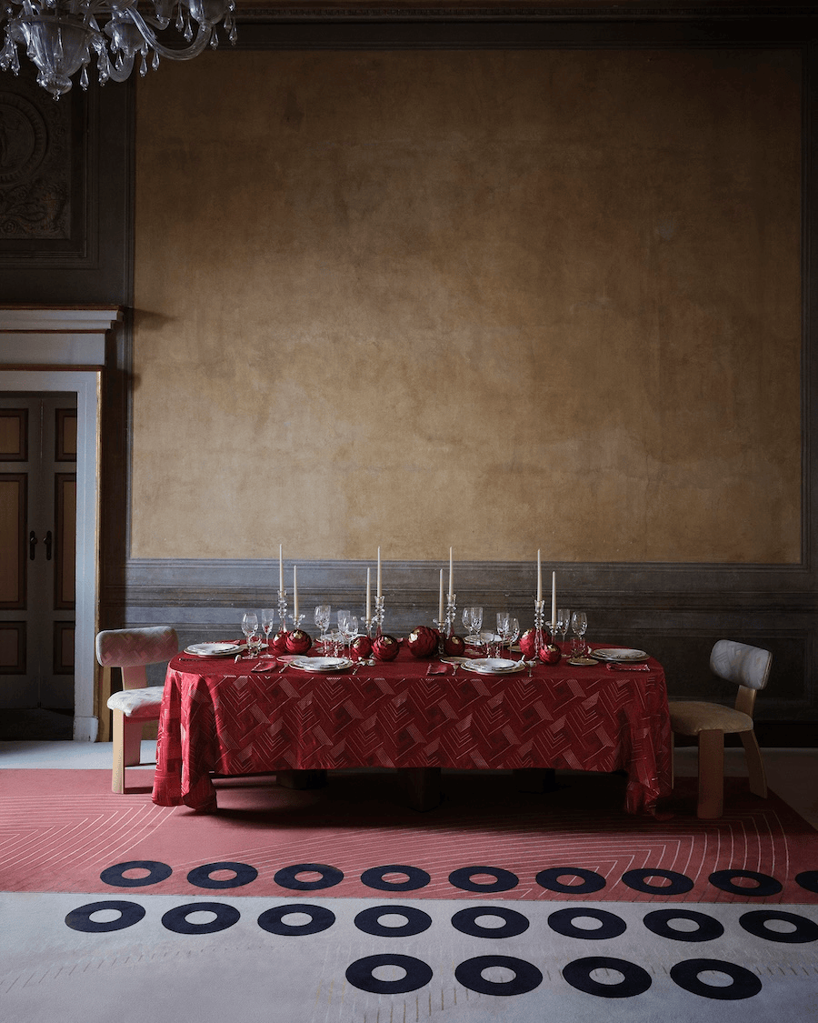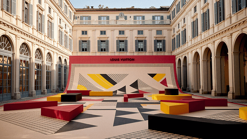 品牌还与布雷拉美术学院合作,在宫殿庭院打造巨型地毯装置,将 Pierre Legrain 的书籍装帧纹样转化为可行走的建筑表面,连接传统工艺与当代教育实践。