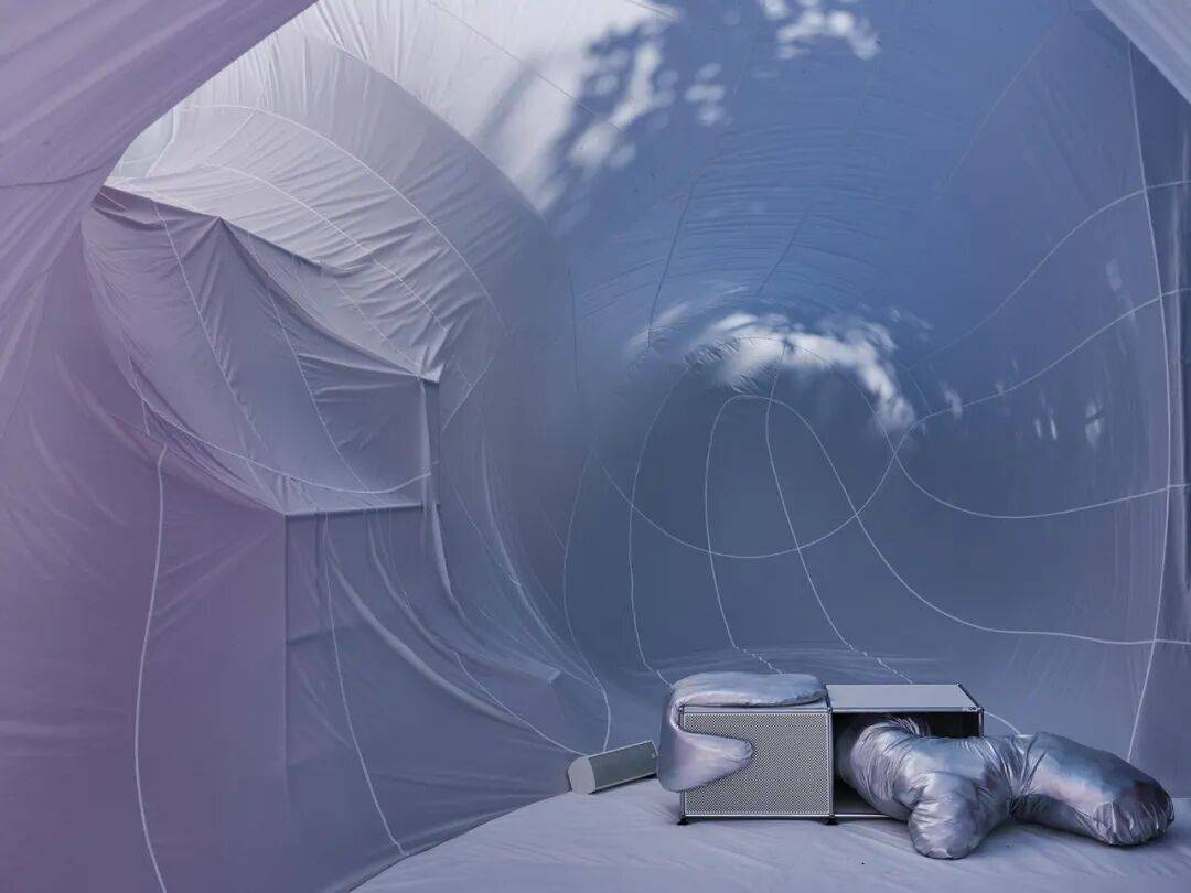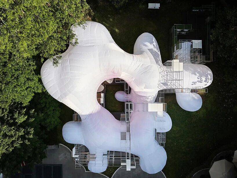 网格中嵌入巨大的白色纺织充气软膜,软膜缓慢膨胀、收缩,形成柔和的曲面形态,与刚性的钢制网格形成强烈的视觉与材质对比,构建出“刚柔并济”的空间张力。