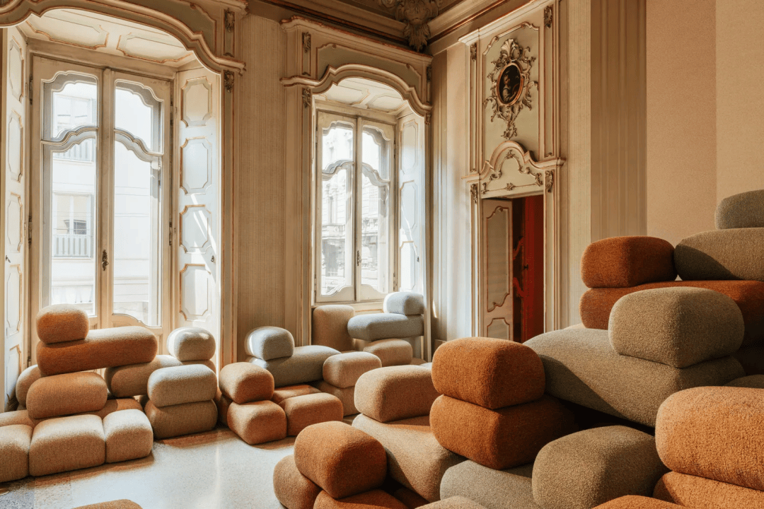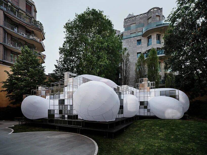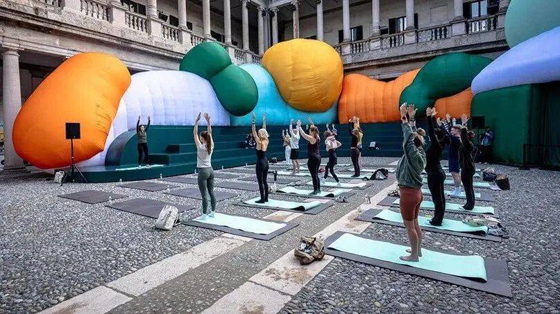 装置选址于米兰 Palazzo del Senato 的巴洛克风格庭院,通过巨型彩色充气模块构建出软质景观,模块造型圆润柔和,色彩鲜艳明快,与庭院的刚性巴洛克建筑形成强烈对比,软化了历史建筑的严肃感,注入了活力与趣味。