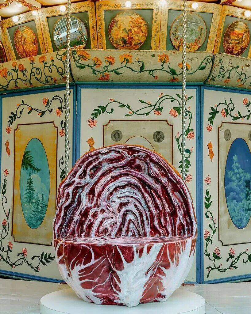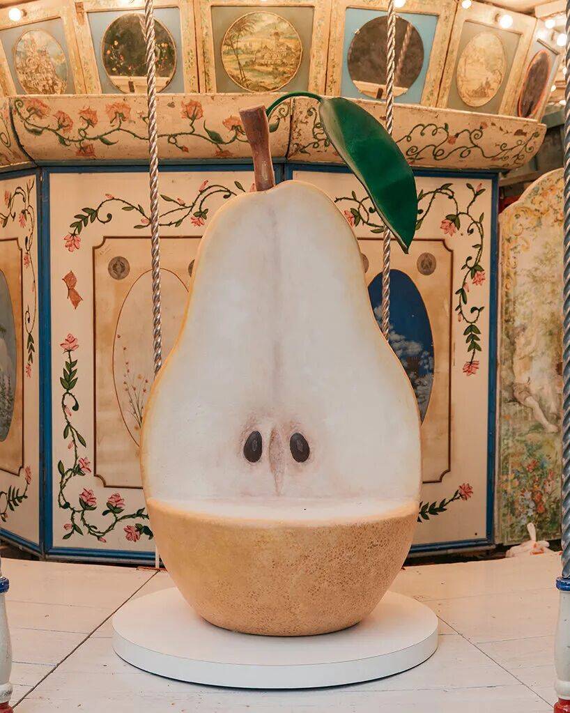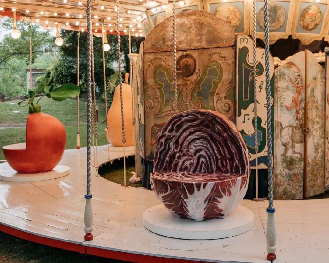 装置以 18 世纪的复古旋转木马为原型进行改造,将传统的木马造型全部替换为巨型蔬果雕塑,涵盖各类常见果蔬形态,通过放大比例与细腻还原,打造出超现实的视觉冲击。旋转木马缓慢转动,形成“重复与变化”的视觉循环,让日常熟悉的蔬果脱离原有语境,成为兼具装饰性与叙事性的艺术符号。