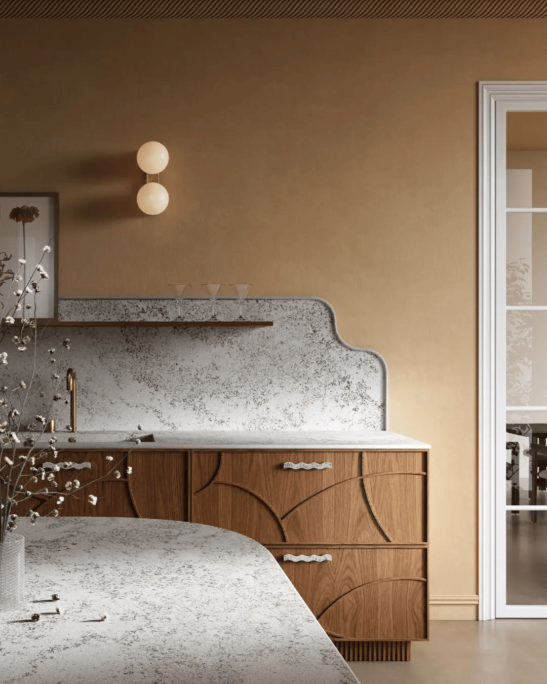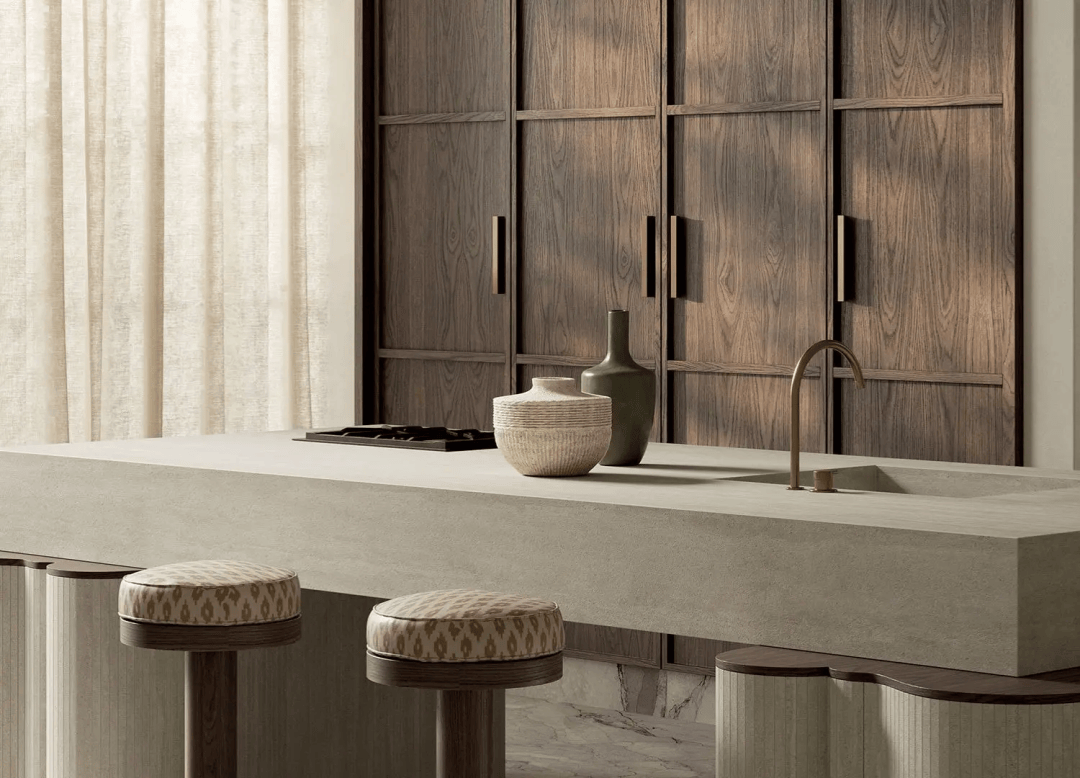 系列采用 DYS 定制印花技术,每一块版面纹理均不重复,核心产品包括:Distressed Rug 仿旧地毯岩板:致敬波斯古毯,做旧剥落纹理露出石材基底,呈现时间侵蚀质感。