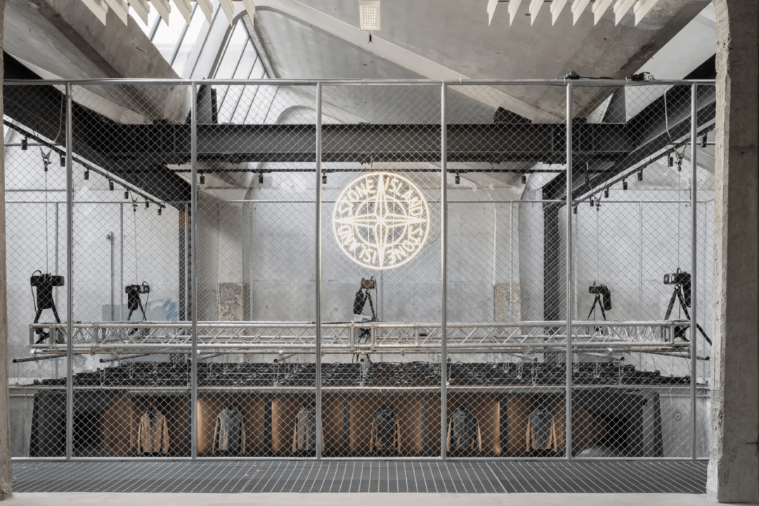 Stone Island 重启品牌创始人 Massimo Osti 在 1989 年提出的 NO SEASONS(无季节) 概念,与米兰设计工作室 NM3及视觉团队 700×100 合作,在废弃泳池改造的 Capsule Plaza 内打造沉浸式装置,以 “材质即主角” 为核心,回归面料研发与工艺本质。