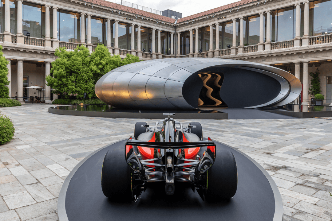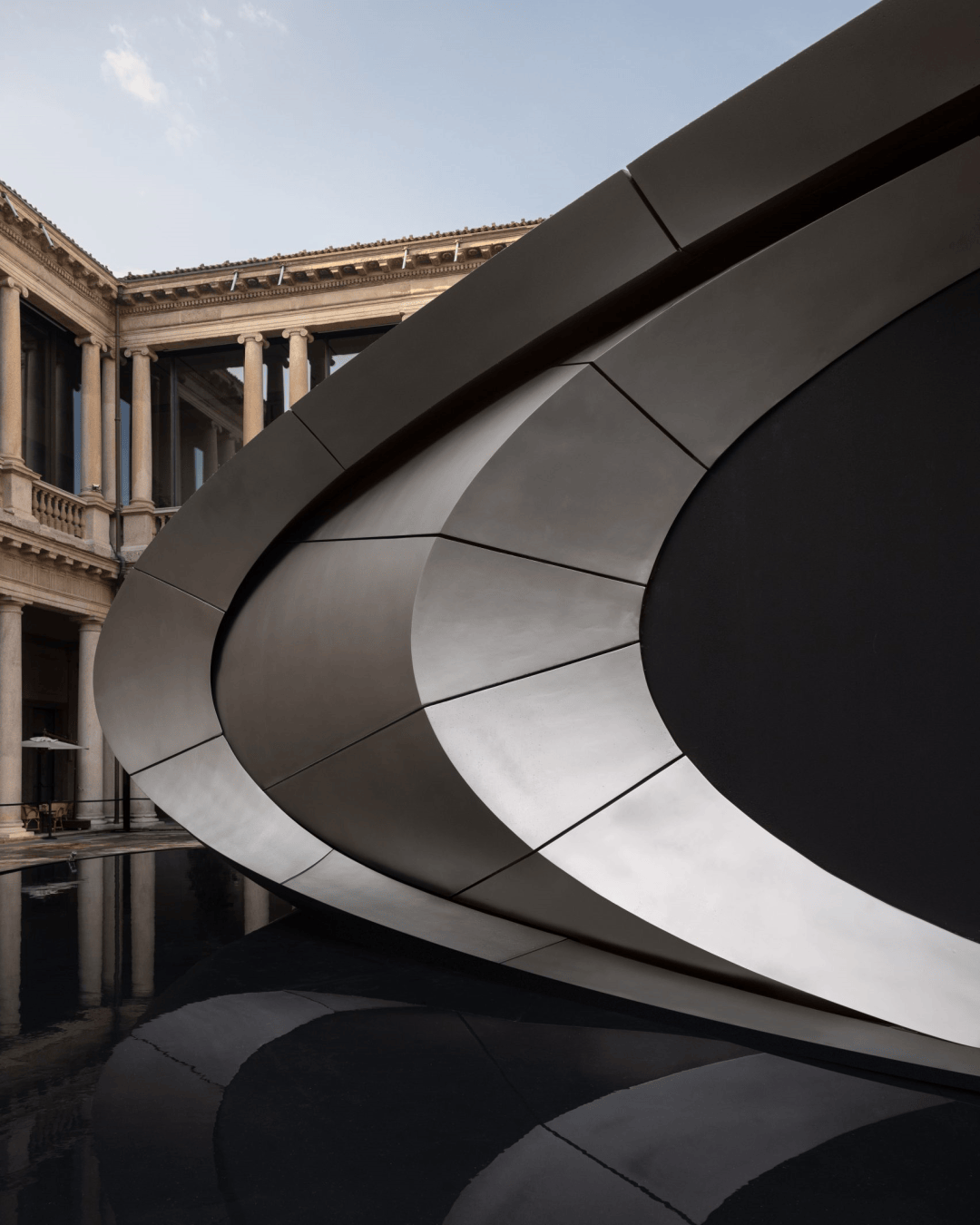 跨界阵容中,奥迪与扎哈・哈迪德建筑事务所合作的 Origin 装置格外瞩目,在米兰前主教神学院(现 Portrait 酒店)庭院亮相,以先锋建筑语言诠释品牌未来愿景。