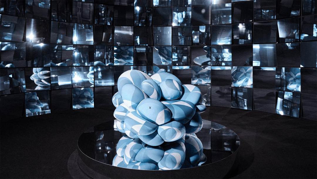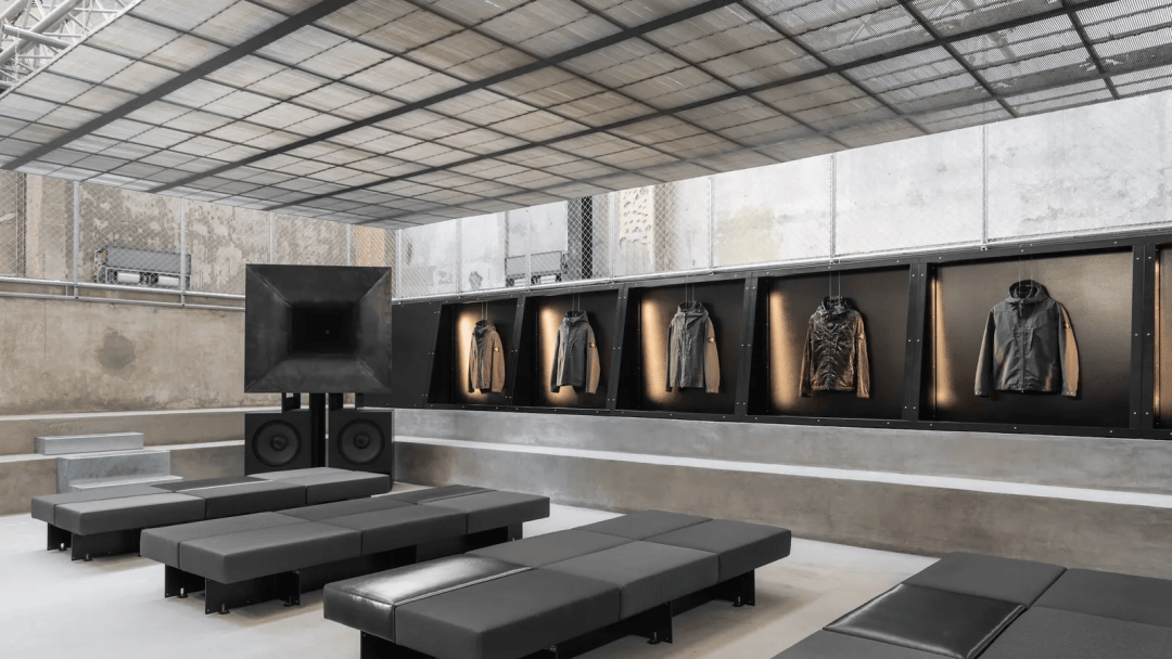 空间由 NM3 以干式金属装配系统搭建,顶部悬挂 4×8 米巨型 LED 天幕,播放 700×100 制作的品牌面料研发影像,搭配 Friendly Pressure 定制号角音响系统,呈现视听一体的材质实验空间。