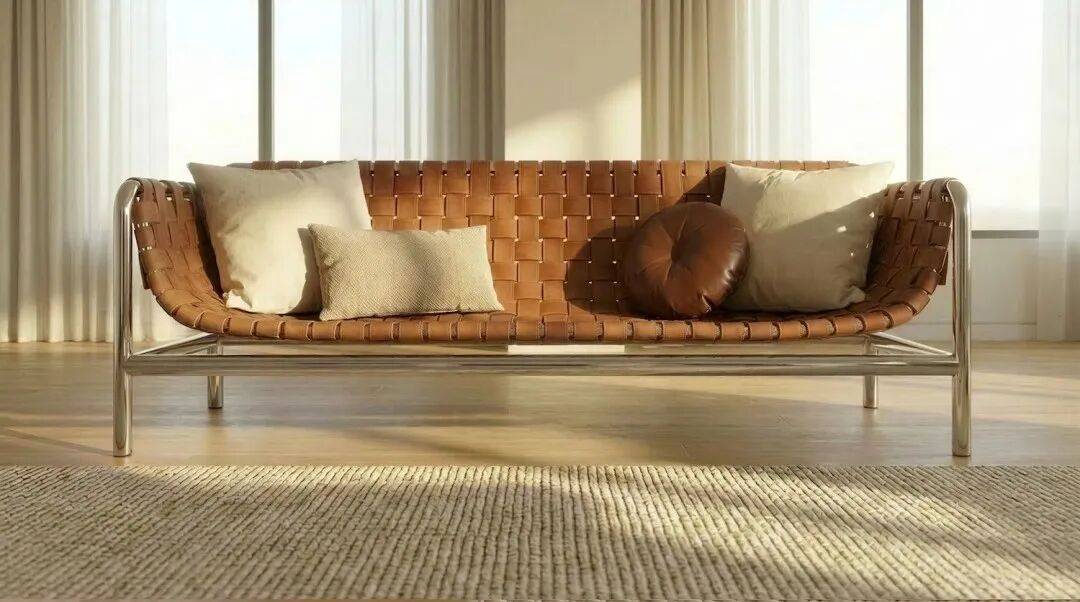 沙发与椅子的表面采用编织皮革带,精准模拟玄武岩石路的粗糙肌理,钢架结构借鉴城市测绘网格的规整感,外露的焊接节点刻意保留,彰显手工制作的温度与质感。