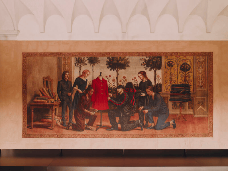 展览核心是 12 幅巨幅挂毯,以文艺复兴绘画风格描绘品牌关键节点,从创始人 Guccio Gucci 在伦敦萨伏伊酒店的学徒时光,到 Bamboo 1947、Jackie 1961 经典包款诞生,再到历代创意总监的标志性时刻,甚至融入 Demna 本人的设计场景,用符号化细节串联起品牌的辉煌与变迁。
