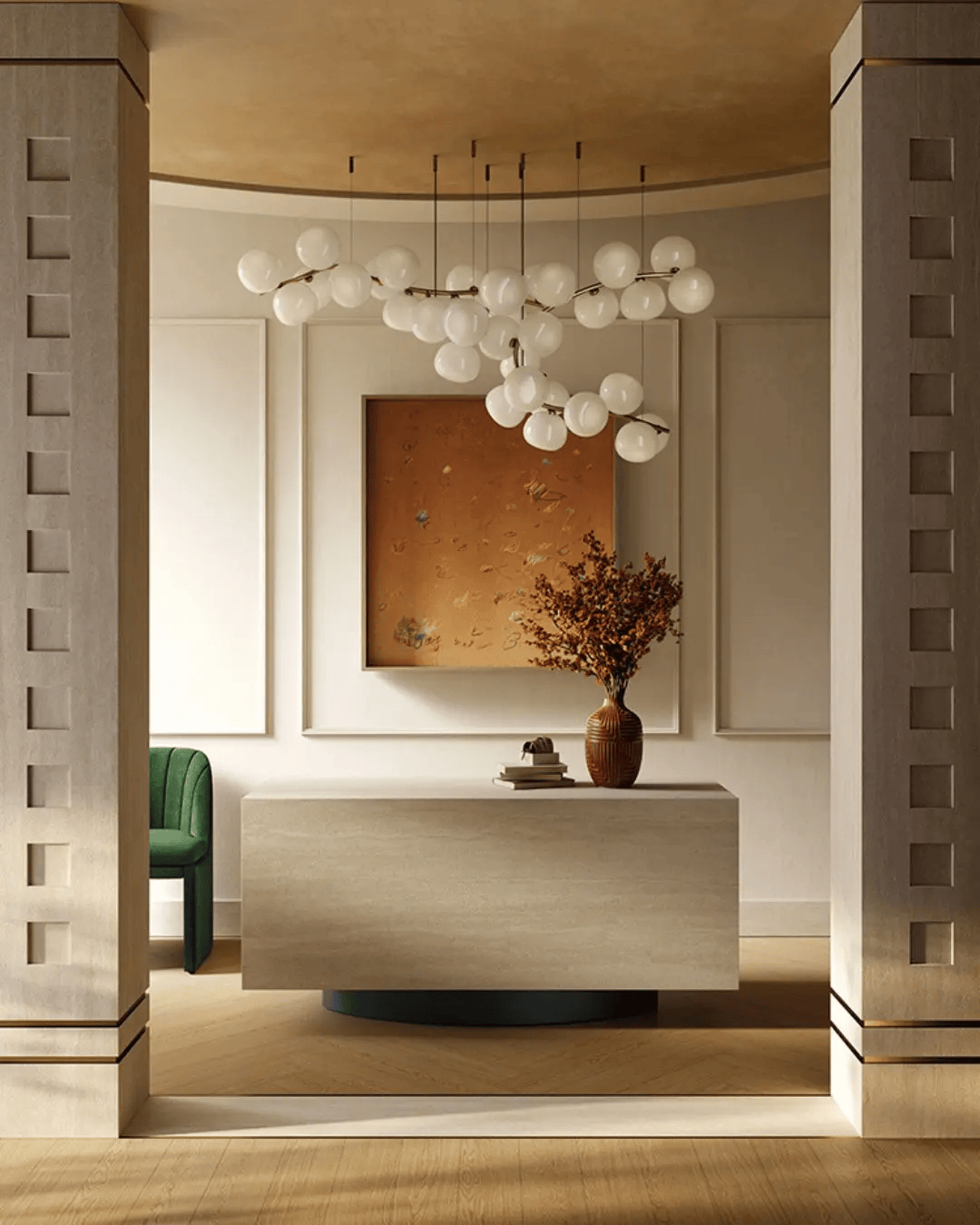 空间由 H&M Home 创意总监 Evelina Kravaev‑Söderberg 与 Kelly Wearstler 共同打造,将现代廓形置于古建壁画与古董地板之间,形成过去与现在的碰撞。系列主打模块化,兼顾易运输与自由组合,适合全球多元户型。