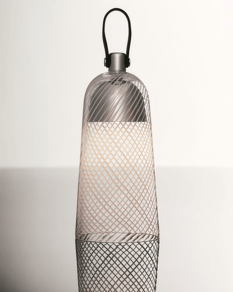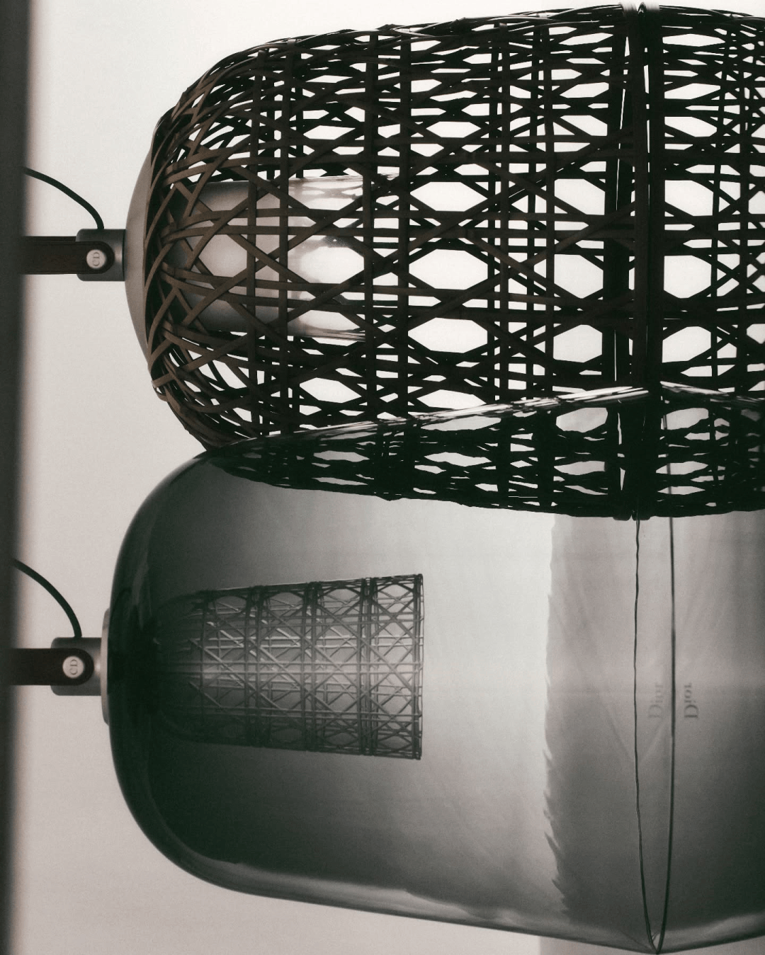 灯具采用威尼斯穆拉诺手工吹制玻璃,以曲面与褶皱模拟布料垂坠感,光影通透如裙摆律动,同时融入日本京都斑竹手工编织工艺,重新演绎品牌标志性Cannage 藤格纹,实现法式装饰艺术与日式匠艺的融合。系列以灰、粉、白为主色调,含台灯与便携充电款,手柄与按键处镌刻 CD 徽标。