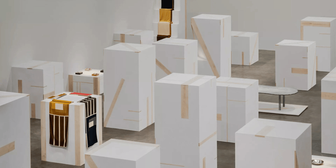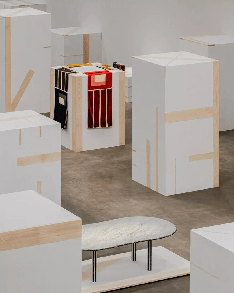展览由建筑师 Charlotte Macaux Perelman 设计,以山毛榉与石膏模块构建错落“城市网格”,家居单品如同坐标散落其中,引导观众在移步换景中感受材质魅力。