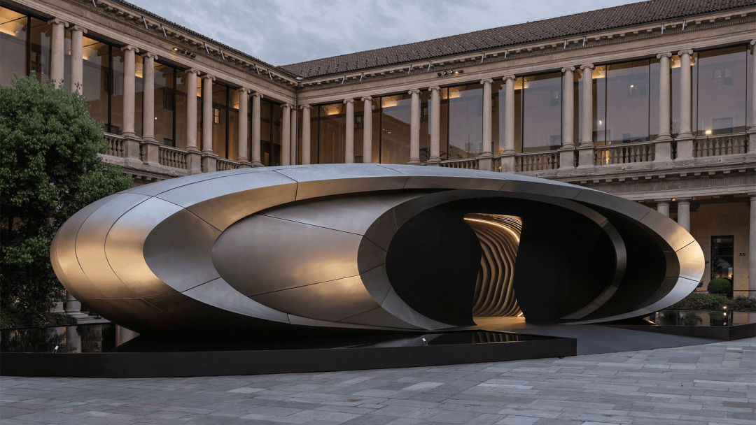 展馆以钛金属哑光质感与流畅线条打造,表面随日光流转呈现动态光影,旨在为设计周观众提供对抗感官过载的静谧空间。