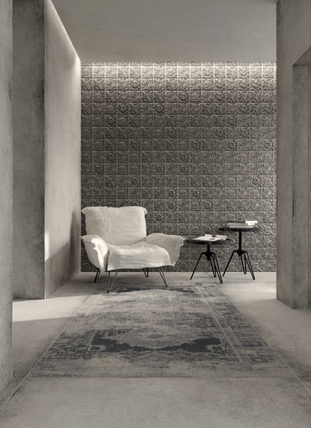 Diesel Living 与 Iris Ceramica 迎来十年联名,这次推出了 Reloaded 陶瓷系列,由 Glenn Martens 主导创意、Controvento 建筑团队打造空间,以迷幻流行、做旧失真为风格,将时装秀场语言转化为瓷砖与岩板设计。