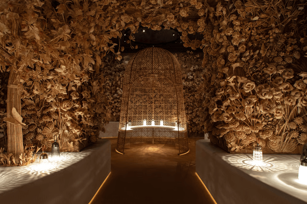 展览空间是由泰国艺术家 Korakot Aromdee 与 Vasana Saima 打造的有机花园场景,还原 Christian Dior 童年故居的自然意境,让灯具在历史建筑与花艺氛围中呈现“光作为材质”的诗意表达。