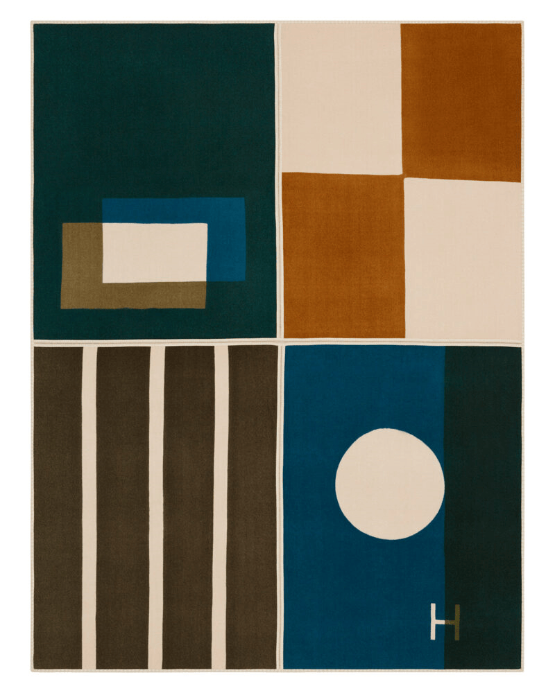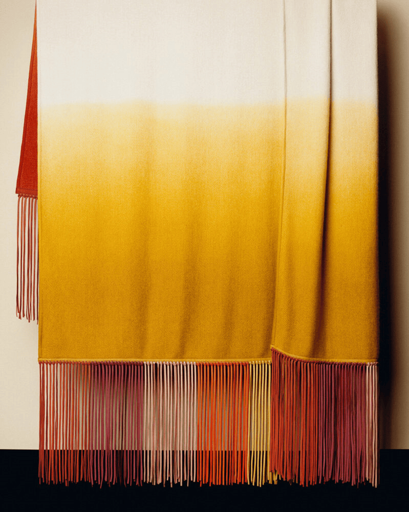 手工编织羊绒毯以 resist-dyed 工艺呈现低调 H 标识,柔软触感与精致细节兼具,延续品牌 “低调奢华” 的内核。