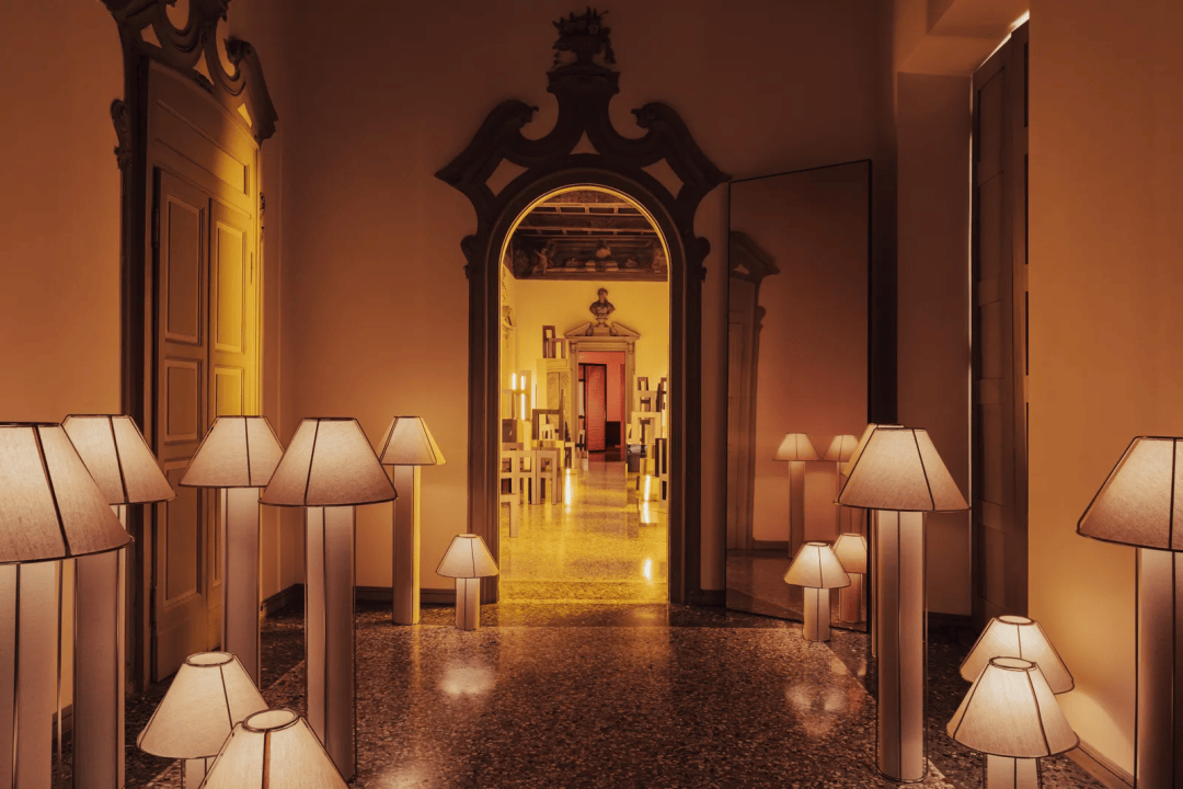 Dior Maison 于米兰 Palazzo Landriani 宫殿呈现全新 Corolle lamps 灯具系列,由法国设计师 Noé Duchaufour-Lawrance 创作,致敬 1947 年 Dior New Look 经典 Corolle 花冠裙摆,将高订时装轮廓转化为光影雕塑。