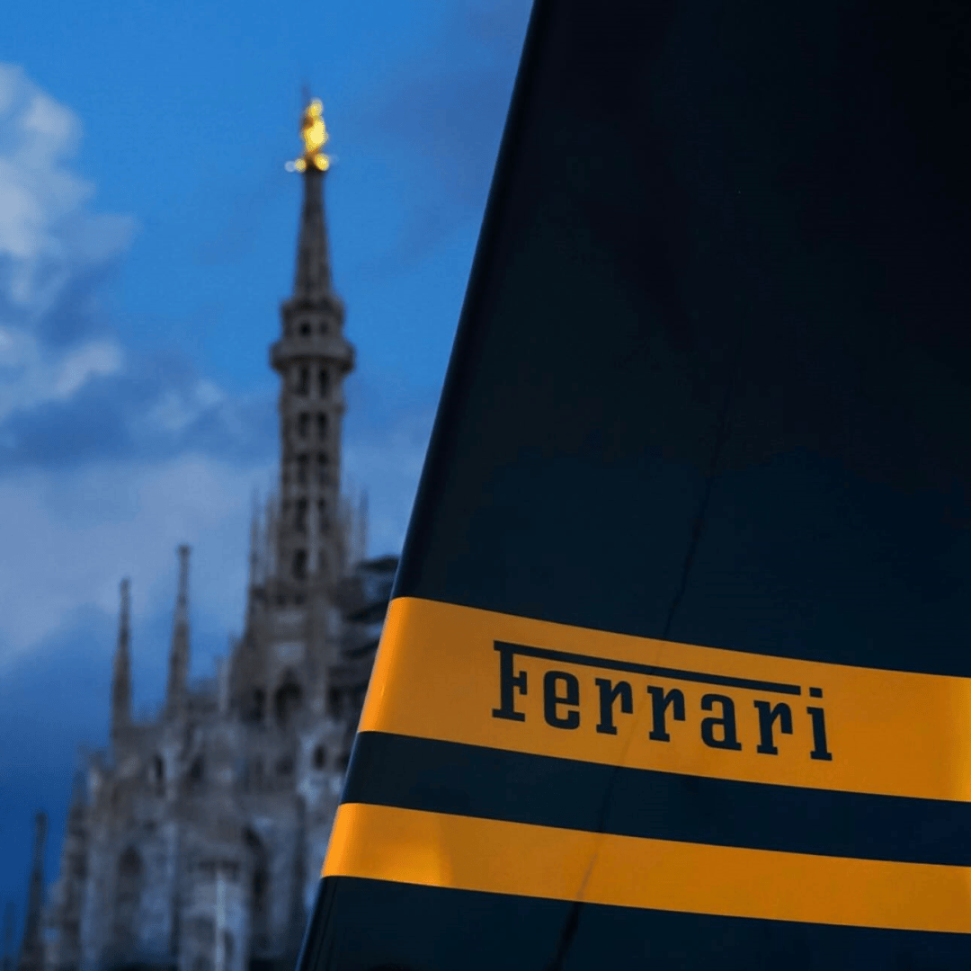 帆面印有法拉利长形 F 标识,延续近年 F1 赛车、Daytona SP3 等作品的视觉符号,强化品牌辨识度。