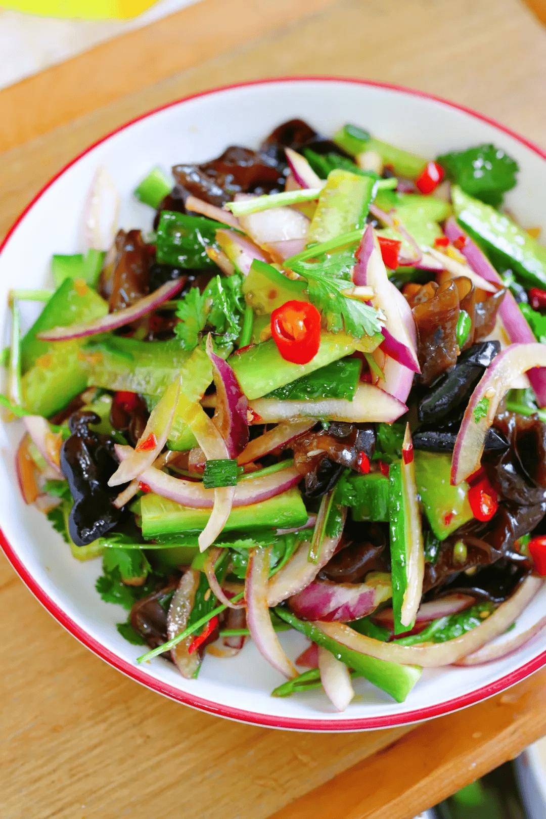 食材:黑木耳,洋葱,黄瓜,小葱,蒜末,小米椒,辣椒油,热油,食用油,生抽,老抽,白糖,鸡精,香菜,