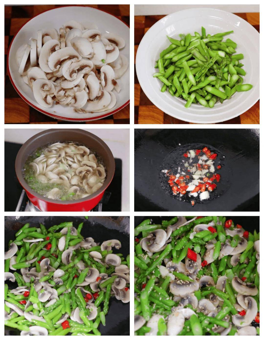 3、锅里水开之后,先把口蘑放进来炒水一分钟,再放芦笋进来煮一分钟,芦笋一定要焯水,它含有草酸,捞出来之后控干水分。