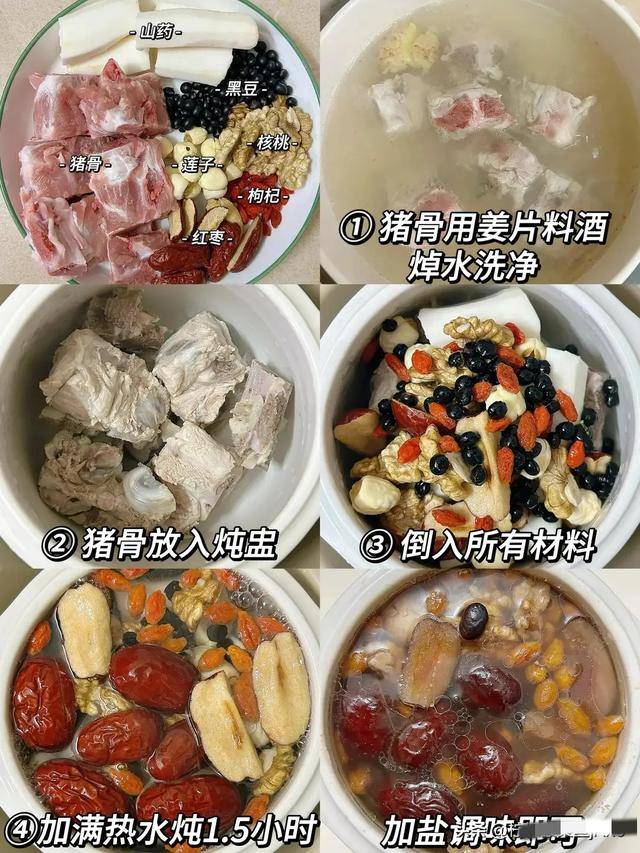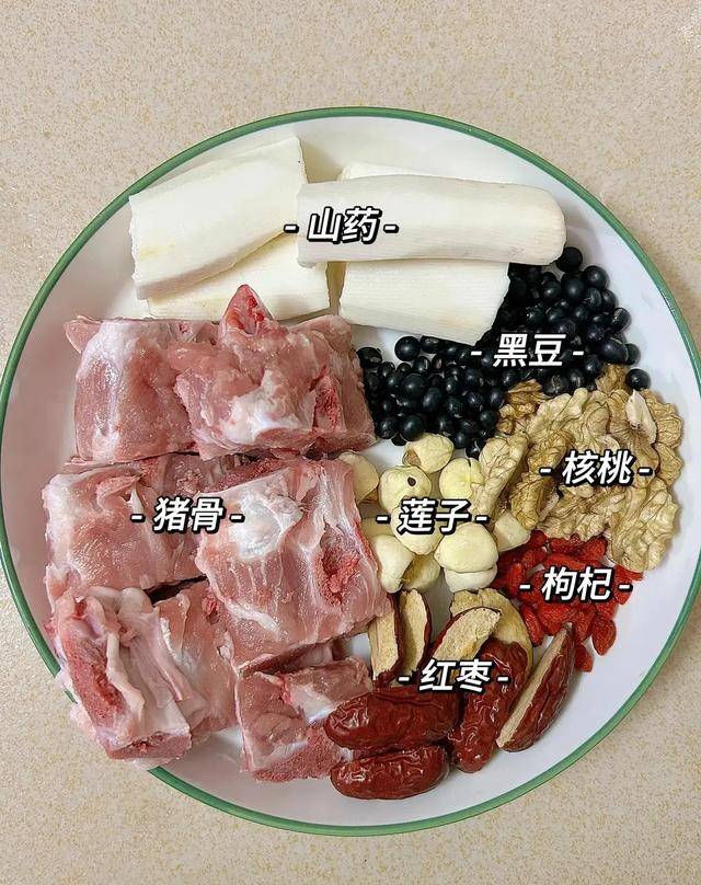食材:黑豆小半碗、核桃仁三四个、猪骨头一斤(筒骨或者脊骨都行)、红枣五六个、生姜三片