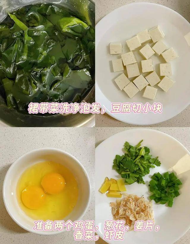 干裙带菜用凉水泡开,泡个十分钟就差不多了,别泡太久。泡好后切成小段,太长了不好入口。嫩豆腐从盒里倒出来,切成小方块,切的时候轻一点,别弄碎了。鸡蛋打散备用。