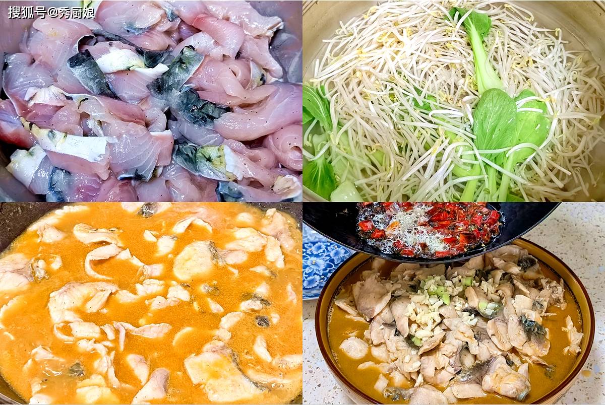先把黄豆芽或者莴笋片扔进去焯熟,捞出来铺在大碗底下。接着开小火,把鱼片一片片滑进锅里,变色就捞出,铺在菜上,再把汤倒进去。