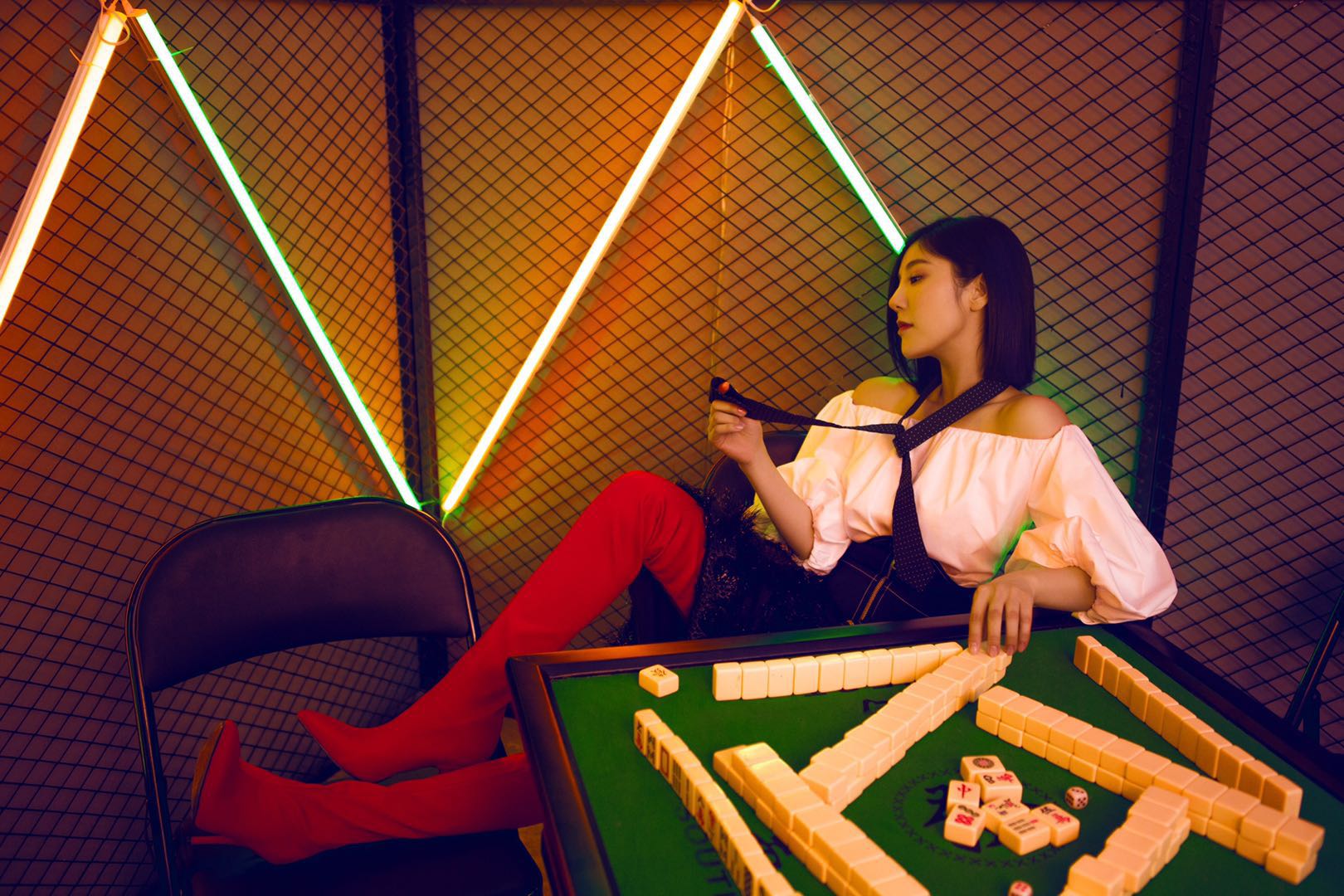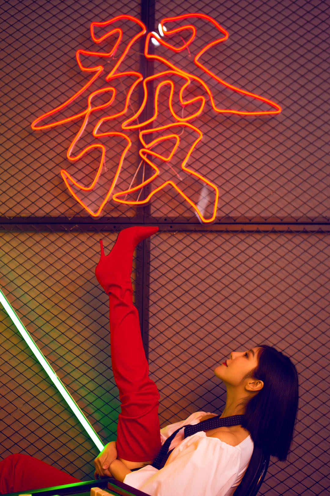 近期,赵奕欢一组复古写真曝光。在颜色鲜明的复古场景中,赵奕欢身穿一字肩上衣搭配黑色皮裙,脚踩过膝红色长靴,长腿优势一览无余。