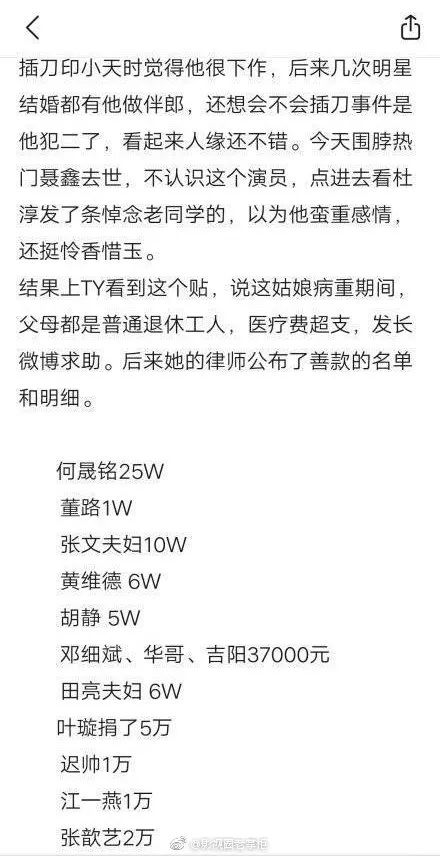 很久没有动静的杜淳最近上热搜了! 原因是被狗仔拍到和一位女生共同回家的画面,疑似新恋情曝光。 根据狗仔的描述,杜淳5月10号的时候和一位神秘女子在KTV喝酒喝到深夜,酒局结束后随行女子上了杜淳的车,与其一同回到男方家小区。 之后两人分别下车,女方整个过程很是谨慎。 新闻曝出后有媒体就此向杜淳经纪人求证,其听到来意后,立即挂断了电话。 避而不答,看来是有猫腻哦? 不过看到这个新闻,阿美的第一反应是:这好像在哪里见过? 去年10月8日,杜淳也被拍到过恋情曝光的新闻。 很巧的是,杜淳当时也是与该女子去K歌了, 之后同样一起回到杜淳所住的小区。 媒体求证杜淳方工作人员时,对方也未回应。 虽然画面太模糊,我们无法知道女方是不是同一人。但看这几乎一样的新闻报道,K歌后一起回家似乎是杜淳的常规操作哦。 说起来,目前还是未婚状态的杜淳,最近花边新闻似乎不少呢。 前段时间网络上还有杜淳与陈乔恩已经领证结婚的不实传闻。 两个人只是合作过《旋风孝子》而相识,平时微博上也鲜有互动,可以说这个传闻是空穴来风。 但没想到事态愈传愈烈,最后陈乔恩本人发博澄清,才得以平息。 除了恋情方面的新闻引人注意之外,提到杜淳,大家可能最先想到的就是他当年插刀教的事件。 当初印小天曾被爆出打同剧组女演员边潇潇,然后杜淳、李晨等一群好哥们开始微博帮被打女演员说话。 特别是杜淳,说印小天不够男人,还和粉丝互动说印小天泡妞不成就打人。 结果现场视频证明印小天并没有打这个女演员。 因为当年这个插刀教事件,印小天最开始被全网黑。后来真相大白后,换成了杜淳和李晨等人被全网嘲。 去年杜淳在《吐槽大会》中还特意提到了这件事,说自己和印小天并不是兄弟,所以没有“插刀”一说。 看看印小天早年的微博,你们真的只是普通的合作关系吗? 而且,普通的合作关系就可以在不明真相的情况下在微博指责对方并且带节奏吗? 除了提到插刀教事件之外,杜淳在《吐槽大会》上还澄清自己当年并没有抢印小天的代言,随后工作室也晒合同否认。 没想到的是,印小天的前经纪人肖涵天发了朋友圈回应杜淳。 “谁带你认识的衣柜老板自己心里没数吗”,“衣柜老板”指的应该就是海澜之家了,这个从工作室晒的合同可以看出。 前经纪人都出来发声了,看来是对当年的事情耿耿于怀。 别的明星上《吐槽大会》都是澄清和洗白,但翻了翻评论,杜淳上了这档节目后果然是越洗越黑了。 值得一提的是,网友们的记忆力都太强大了。在吃完插刀教事件的瓜之后,大家又扒出了杜淳以前的另一桩渣事。 杜淳有一位老同学叫做聂鑫,曾经拍摄过《蓝狐》、《奇迹世界》、《鹰笛天缘》等影视作品。 但在2014年的时候,由于拍摄时出车祸,最后抢救无效去世了。 在老同学聂鑫病危的时候,杜淳曾带一帮记者去医院看望聂鑫,医院里和记者谈笑风生。 回来发了很多通稿,内容都是说自己有情有义。 结果被网友们发现,娱乐圈朋友给聂鑫众筹捐款的时候,杜淳一分钱没捐,反而何晟铭捐了25万。 何晟铭为了怕别人说自己是为新戏炒作,还特意嘱咐大家不要将自己的名字曝光。这和杜淳的表现一对比,差距可太大了吧? 除了人品备受诟病以外,杜淳今年参加《声临其境》这档配音节目也被网友们指出台词功底差。 在配胡歌的《伪装者》时,张国立就吐槽说,一听这个声音就不是北京人。 配黄渤的《假装情侣》时,又配出了偶像剧男主角的感觉,和原版差距太大。 而同是嘉宾的严屹宽和秦昊表现则比他好得多,全场观众也都把注意力集中在他俩身上。 人品和实力同时都被指责,看来杜淳想要改善网友们对他的印象,还有很长的一段路需要走哦。 最后,阿美还是想说:艺人虽然可以通过发通稿吹嘘自己人品,营造出自己想要的人设,但自己真正的实力和品质如何,身边接触过的人都明白的。因此,时间真的能证明一切,不是靠参加什么节目发什么通稿就能洗白的。 |