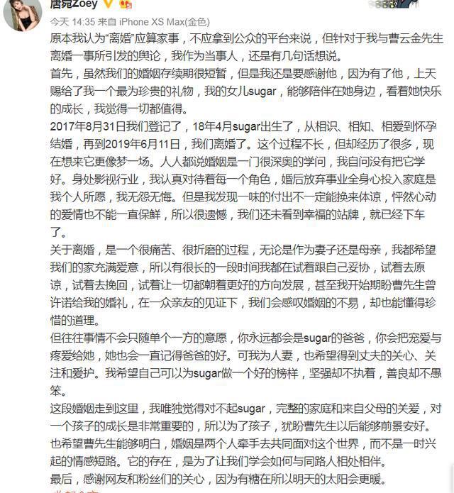 大家综合这些年曹云金的口碑作为,以及他和唐菀在某综艺节目中的言行举止,再加之当初的劈腿绯闻,自然而然的让大家认为他就是过错的一方。从而在他的微博下,对他进行强烈的指责。 当初曹云金与师傅郭德纲决裂时,他的人设险些崩塌,如今与唐菀离婚,让他的人设再次动摇。 众所周知,唐菀自嫁给曹云金后,便淡出娱乐圈,专心在家相夫教子。他们的女儿如今才一岁零两个月而已,正是需要父母呵护成长的时候,可是却在这种时候,二人的婚姻却走到了终点。这会对孩子的心灵与成长带来不可避免的伤害。 随后,唐菀也发文表示:离婚的过程中,她也曾妥协、原谅、甚至挽回,让一切都朝着好的方向发展。甚至,也期盼曹云金曾经许诺过的婚礼,让彼此懂得珍惜。然而,事与愿违。如今只觉得对不起女儿,没有给她一个完整的家,但仍祝愿曹云金前景安好,更希望他能懂得婚姻存在的意义。 由此可知,离婚这件事是曹云金提出来的,即便唐菀的挽留退步,他都无动于衷。冷酷决绝的结束了这段貌合神离的婚姻。 不过,在二人拿到离婚证后,曹云金向唐菀转款500万元,以此当做他主动结束了这段婚姻的补偿。 如今,二人离婚的事情闹得沸沸扬扬,恐怕再难有回头的机会。唐菀发文坐实前夫渣男本质,婚礼化为泡影,曹云金用500万结束婚姻,虽然这个数目不小,但是对唐菀而言,若是没有经历这一段“错误”的婚姻,恐怕她会有更好的前程。 既然事情已成定局,那么希望唐菀尽快振作起来,找回当年那个美丽自信的自己,重拾心中的阳光。也希望曹云金尽最大的努力当一个好父亲,让孩子快乐成长。 对此,有什么看法呢? |
