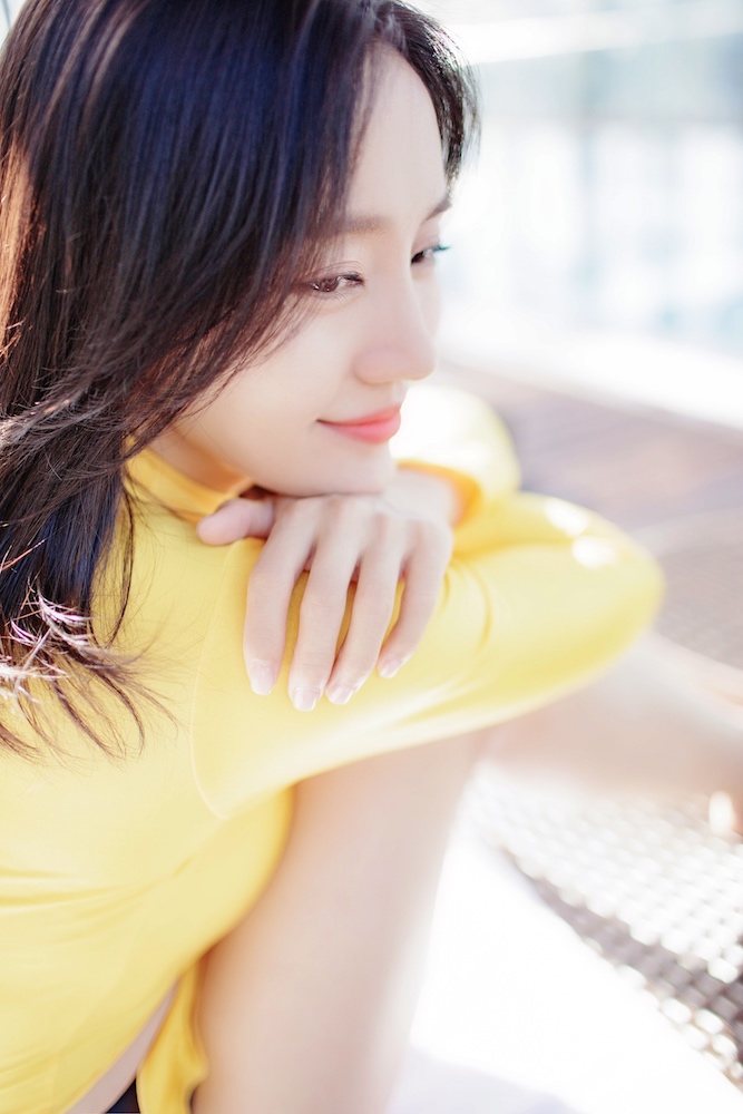 王智身穿柠檬黄上衣黑色短裤,身材纤瘦双腿细又长,笑眼弯弯明媚动人,给人健康活力的感觉。