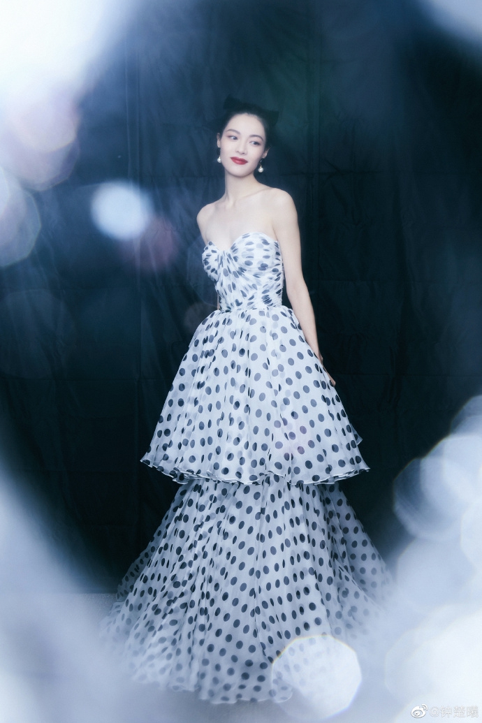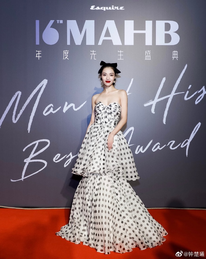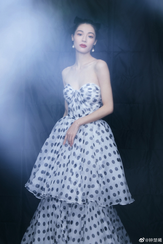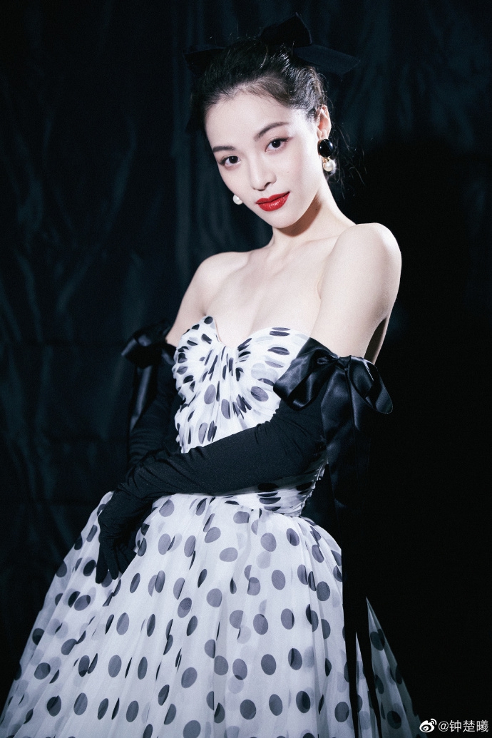 12月18日,钟楚曦在微博晒出自己参加活动的美照,当天她身着一袭黑白波点抹胸长裙,搭配标志性红唇妆容,加上别致复古的蝴蝶结发饰,少了些强势姿态多了几分俏皮甜美,似从油画中走出。