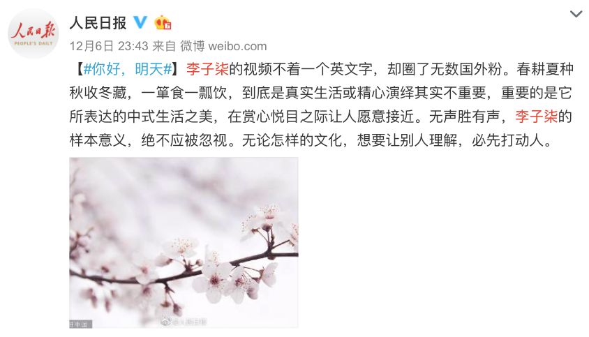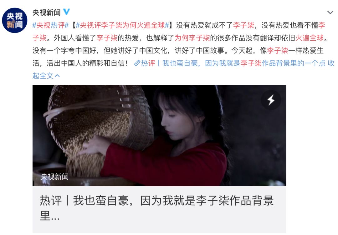 李子柒视频里一箪食一瓢饮的生活美学,触动了人们心底的柔软。 古朴简单的生活样式,让每天跟上了发条一样不得不奔跑的现代人,得到纾解和治愈。 无论多辛苦,“你来人间一趟,你要看看太阳。” 03. 知乎上有个高赞回答: 李子柒的油管频道的对外文化影响力,可以说抵得上1000个CGTN(中国国际电视台)。 对于李子柒的文化传播力,官媒也给了她很高的评价。 但似乎很多人觉得李子柒迎合了外国人对中国的刻板印象,落后、传统的农耕生活。 这种担忧暴露了我们长期的文化不自信。 因为自卑,喜欢秀肌肉。 人们更期待外国人看到我们先进的,酷的,现代的一面,让他们知道我们已经不再是那个落后的民族。 但这是否进入了一个认知误区。 “关于农业的,历史的,传统的,简单的内容,从不是负面印象,反而是渴望与祝福的。” “现代中国给人一种鼓掌的冲动,传统中国给人一种共情的渴望, 二者都是中国形象的正向影响。” 在外国人看来,李子柒的视频,没有输出文字,没有强势灌输文化,只是呈现一种美好的画面,却直击人的内心最深处,打动了无数观众。