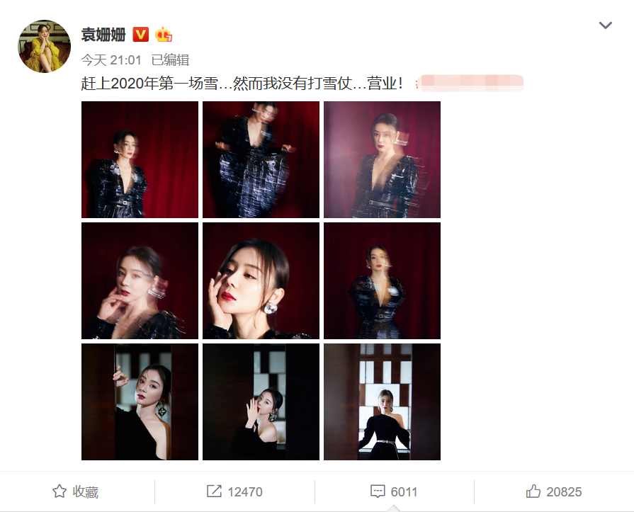 1月6日,袁姗姗在微博晒出一组写真美照,并发文表示:“赶上2020年第一场雪…然而我没有打雪仗…营业!”在一组照片中,袁姗姗身穿深V设计黑色亮片裙,另一组造型中,她一身黑色露肩高开叉长裙,好身材凸显,性感十足。
