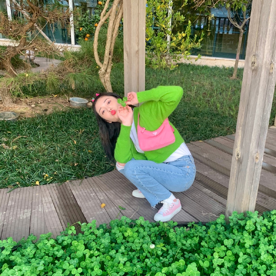 周洁琼扎半马尾晒九宫格自拍 绿色开衫清新休闲少女感十足[9P]