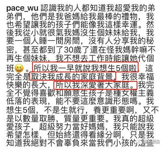 文丨谦叔 葛怡然 图丨来源于网络 吴佩慈又双叒叕生了。 2月2日消息爆出,吴佩慈一副“本来不想说,都是记者来问”的调调。 1月13日诞生的女宝宝,是吴佩慈的第四胎。 记者问她:孩子爹纪晓波的心情如何?她说:纪晓波本来就想要女儿。 如果男方真是女儿奴,至少该发个微博、拍个合照,意思意思吧? 结果不出意外,还是吴佩慈的独角戏。 差不多同样时间(2月1日晚),“恋爱小天才”萧亚轩的《吐槽大会》上线了。 跟小16岁的男友黄皓同台,上热搜显然不在话下。 当1978年的吴佩慈6年半生了四胎,同龄人萧亚轩(1979年生)婚都还没结,人送外号:鲜肉菩萨。 同为40+女性,两种活法,两个极端,是怎么形成的? 前段时间看《花花万物》,“东北F4”成员给康熙带了土特产红枣、花生。 寓意:早(枣)生贵子。 蔡康永打趣小S:现在还有人祝福你早生贵子吗? 小S苦笑:那是个诅咒。 巧的是,小S也是吴佩慈的同龄人,还是华冈艺校的同学。 (右一小S,右二吴佩慈) 小S的第三个女儿,是2012年4月出生,赶在35岁大限之前封肚,算是踩着点儿。 那个时候,吴佩慈在斩断桃花,锁定富商。 2013年9月,35岁的吴佩慈自爆怀孕4个月,男友是纪晓波,往前推,应该是5月份怀上的。 2014年2月17日,在香港剖腹生下女儿“小蕊蕊”,到2020年2月,刚好6年。 35岁以后,还敢6年生4胎,而且4胎还全都是剖腹产。 第二胎儿子Hans到第三胎儿子Hudson出生,四舍五入一下:平均一年半剖一个。 这岂止太拼了,根本是不要命吧? 虽然吴佩慈自己说过,因为家庭成长环境的影响,喜欢大家庭的感觉,所以想要生五个孩子。 但这跟高龄生育竞赛不是一回事儿啊! 但凡婆家、或者自己的妈懂得心疼产妇,根本就不会允许这么个生法。 如果她遇到的不是纪晓波,还至于这么拼吗? 吴佩慈情定纪晓波之后,疯狂秀晒炫的劲儿,不像个女明星,倒像是个看到土豪大哥进了直播间的网红女主播。 纪晓波的人还神龙见首不见尾呢,她就被豪礼感动到cry 了,说再也不用自己赚钱,变成有人送东西了。 松露削成薄片,从头上撒下去,实力cos 冰雪女王…… 2014年2月产女,11月宣布退圈。 之后吴佩慈的生活主要围绕3项内容展开:生娃、开派对、炫富。 自己过生日,孩子过百日办派对就不说了,生产前还要办个“迎婴派对”。 在第四胎备孕期间,吴佩慈说自己好羡慕明星朋友,可以瘦瘦的工作。 等一下,不是你自己不想工作的吗? 一出道就叫苦,嫁了富豪就退圈,明显也没什么事业心吧? 怀第一胎的时候,吴佩慈对外宣称婚礼的事以后再说、放话“未婚生子不是我会走的路”。但她的婚礼,大家始终只是隐隐约约有所耳闻,坊间对她的认知始终是:单亲妈妈。 其实吴佩慈是晒过“一家五口”的照片的,还给准婆婆送了条价值9亿多的龙。 但2月2日的报道里,媒体对孩子爹的称谓依然是:百亿富商未婚夫。 大概,只要派对不停、礼物不停、有人为自己买单,她就能在这个真空的世界里,做她的小公主吧。 萧亚轩显然不是小公主,女猎人还差不多。 她这期《吐槽大会》,很早之前就上过热搜了。 毕竟,交往过17任男朋友,都是顶级帅哥,谁不想看她聊恋爱心经、撩汉秘笈啊?! 虽然自称“平平无奇的恋爱小天才”; 还谦虚“没什么秘诀,只是天赋异禀”; 但萧亚轩还是有教大家一些干货的。 在评价贺军翔身材的时候,萧亚轩用了个很香艳的单词:Delicious 。 节目组还坏坏地配了字幕:可口。 说完之后,萧亚轩喊话现男友黄皓:学着点儿哦。 我身边的女生,过了30岁以后,即使再迷恋小鲜肉,也会自动代入姨母模式,甚至“妈妈爱你”什么的都出来了…… 但在萧亚轩这里,只有纯粹的对正青春的、美好身体不加掩饰的欣赏。说实话,有多少人已经忘了这种感觉? 《致命女人》里的Simone那句“Ah ,youth ~”与之异曲同工。 贺军翔跟萧亚轩拍过MV,但是不敢跟大明星对视。 萧亚轩回顾:我们当时就面对面坐着,我在等你跟我眼神对上。 贺军翔呵呵傻笑,又被萧亚轩补刀:是你自己失去了机会。 敲黑板:女生可以撩男生,不要觉得自己“轻浮”。 真的撩不动,那就不撩,不暧昧,做个普通朋友也行。 男女关系不就是敌进我退吗?敌不动我不动还哪来的恋爱可谈啊? 在遇到黄皓的时候,就是眼神对上了。 尽管相差16岁,而且鲜肉弟弟“对天后的力量一无所知”,还怀疑她装逼,大晚上戴墨镜。 但那又怎样呢,觉得合适,就交往看看。 黄皓自己也说:我们是在认认真真谈恋爱的。 之前直播里,萧亚轩索吻,黄皓反应慢了,她还“诶”了一下。 这次,从一上台的“他们对你怎么样”,到回应观众的呼声亲脸颊,熟练得很嘛~ 黄皓发言,萧亚轩就站在他旁边,休闲得像是在自家客厅。 吐槽吐得猛了,会给个手势警告。 这种身体语言,透露出的是彼此不设防、充分信任的关系。 再次敲黑板:既投入恋爱关系,又能充分放松,大家都享受。 这些属于交往过程中的攻略,如果谈不下去,不谈了呢? 萧亚轩借着容祖儿惨遭劈腿,讲了自己的处理方式:剪断它! 什么“鲜肉菩萨”都是别人说的,多少有点托大,我最羡慕萧亚轩的是:磊落。 想爱谁就爱谁,想怎么爱就怎么爱的磊落。 这本来应该是最简单的事,却成了很多人最先丢弃的法则。 至于年纪,那是最不重要的事情。 过年遇上热心的三姑六婆,最容易发生的事情就是:被催婚。(今年情形特殊,但微信里她们也是可以催婚的) 她们的理由也很堂皇:什么年纪就该做什么样的事。 这种理由