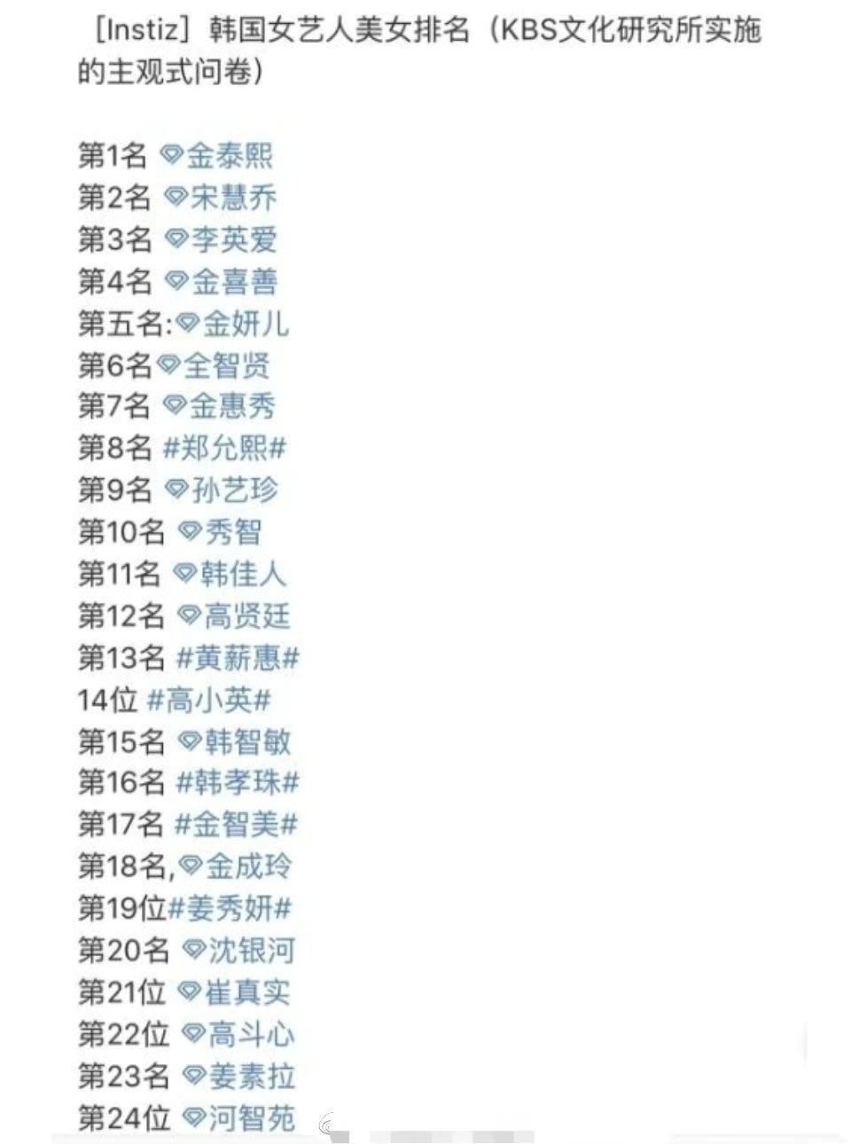 韩国KBS文化研究所实施的主观式问卷,韩国最美女星排名24位中有很多中国观众熟悉的女星,比如第二名到第四名的宋慧乔、李英爱、金喜善等,在亚洲都有一定的知名度,看来英雄所见雷同。 金泰熙虽然在中国知名度不是很大,但她也出演过《天国的阶梯》,首尔大学服装设计专业毕业,后从事模特工作,再转为影视演员,现年39岁的金泰熙很快将迈入40岁,她是著名歌手郑智薰的老婆,两人结婚3年多,奉子成婚,已育有一女儿,目前在读被传已经怀孕,预产期在今年9月份。金泰熙和郑智薰是拍摄广告结缘,后发展成为明星夫妇。金泰熙虽然不是表演专业院校毕业,但其获得很多表演奖,也是颜值和演技双在线。 宋慧乔应该是整个亚洲比较熟知的女演员,出演过很多经典影视剧,特别一部《太阳的后裔》让她和前夫宋仲基成为亚洲最著名的CP,想不到两人结婚不到一年就离婚,这个再度让亚洲CP粉心碎,尽管宋慧乔已经38岁的宋慧乔不再年轻,但颜值保养很好,还是那么的端庄贤淑,可以在清纯或美艳中自由切换。她的美貌有目共睹,是大家都比较欣赏的女星。武汉爆发新型冠状病毒肺炎疫情,宋慧乔还在社交网站发文声援武汉,作为拥有大量中国粉丝的她,还是值得大家追捧。 49岁的李英爱获得第三名,这也是众望所归,其颜值也是高爆,演技更甚,尽管嫁为人妇,育有一双儿女,但她每一次出现在公众场合都是令人惊艳,其气质不仅优雅,看起来更加的高贵和平易近人。一部《大长今》让她成为亚洲女神级偶像,虽然近年作品不是很多,但其影响力还是很深远。尽管已经快50岁,但李英爱保养还是很赞,气质依然迷人。李英爱被称为氧气美女,主要还是她天然去雕琢的自然容颜。 韩国女明星都热衷整容,宋慧乔和李英爱都是天然美女,基本上没有动过刀,但关于金喜善也是有整容的质疑,因为她的女儿并没有遗传她的美貌基因,所以大家都认为她并不是天然美女,但她和成龙主演的《神话》给人更多的惊艳感觉,完美的五官令人印象深刻。金喜善后来参演《幻城》,依然很美丽,但因为作品原因并没有再度走红。42岁的她早已嫁给韩富 二代朴周永,育有一女。 38岁的全智贤凭借《我的野蛮女友》和《来自星星的你》走红亚洲,成为极富个性的偶像,全智贤不算是五官很完美的女星,但绝对是很有个性的女星,173厘米的高挑身材,让她成为妖娆的冷美人。2012年全智贤与韩服设计师李英熙的外孙、时尚设计师李贞宇之子崔俊赫在首尔新罗酒店举办婚礼,目前育有两名男孩。全智贤排名第六名,应该是气质和演技取胜。 目前和玄彬主演《爱的迫降》的孙艺珍,也是韩国资深的演技派女演员,38岁的她和玄彬多次传出绯闻,但两人都予以否认,只是好朋友。出演过多部经典影视作品的她,凭借《外出》获得第51届亚太电影节最佳女主角。凭借《恋爱时代》获第43届韩国百想艺术大赏电视剧最佳女主角奖。凭借《德惠翁主》获得第53届韩国电影大钟奖最佳女主角、第53届百想艺术大赏电影最佳女主角和2016年度电影奖最佳女主角等。虽然不是美艳惊人,但气质优雅,演技精湛,令人印象深刻。孙艺珍排名第九,这个看来不是拼演技,应该还是拼颜值。 38岁的高小英是著名男星张东健的老婆,其也演出很多影视作品。前段时间张东健、朱镇模被爆大 尺度的聊天记录,结果双方都否认是被黑客恶意篡改敲诈勒索,这事算是已经平息,张东健和高小英并没有传出不和,两人结婚9年,育有一双儿女。高小英排名第14位。 去世11年的著名女演员崔真实也上榜,排名第21位,她长相并不是很出众,但演技还是很厉害,曾经9次韩国青龙电影节人气明星奖 ,2次青龙电影节最佳女演员 ,4次百想艺术大赏人气明星奖,2次百想艺术大赏最佳演员(大赏) 。1997年缴税最高,还获得韩国总统奖。崔真实在2008年承认花费2100元人民币做了鼻子的整形。其因为难以忍受网友恶评上吊自杀,之后其弟弟和前夫相继自杀,也是令人傻眼,非常的不幸。 上榜的其实都是大家很熟悉的一些女演员,她们几乎都是颜值和演技双在线,而且具有一定的知名度,其实韩国自然美女很少,大多数都微整,像崔真实都做过鼻子,其他的女明星多少也在脸上动过刀,不过宋慧乔和李英爱应该比较真实和自然。 |