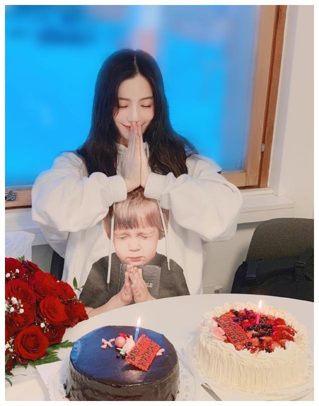 照片中,baby手捧玫瑰花甜笑,对着蛋糕许愿,满脸幸福仙气十足。