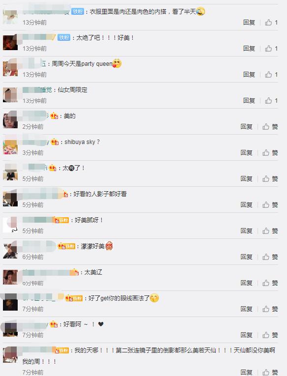其他粉丝看到她的这身look后纷纷留言:“衣服里面是肉还是肉色的内搭,看了半天”、“太绝了吧!好美!”、“我的天哪!第二张连镜子里的倒影都那么美若天仙!天仙都没你美啊我的周!”。