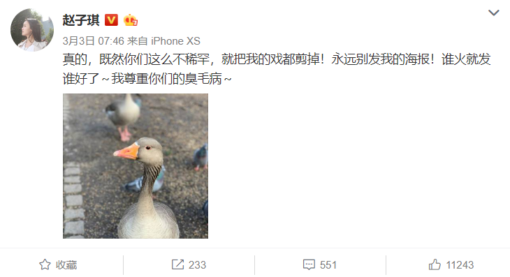 最近这段时间,随着网剧《重生》开播时间的临近,有关于该剧的话题也是不少,而其中,最受外界关注的,显然就是女一号赵子琪开撕剧组的事情了,而这件事的起因呢,也要从《重生》剧组3月2日当天的一条微博开始说起。 当天,《重生》剧组如往常一样在微博上发文晒照宣传新剧,但值得一提的是,此次剧组放出的四张宣传海报中,除了三位男主演之外,仅仅只有一张女主演的海报,并且,这张海报的人物还是女三号赵今麦的,完全没有赵子琪什么事儿。 而这件事儿闹得,也是让女主角赵子琪相当不满,随后,在3月3日早上,赵子琪就连发三条微博怒斥剧组,第一条微博中,赵子琪表示:“哈哈哈,姐不配拥有姓名!不配拥有流量!!!!! 好得很~姐只配拥有这样的剧照,不配拥有正经海报、不配拥有女一号!了解了~ ” 随后,赵子琪第二条微博则称:“真的,既然你们这么不稀罕,就把我的戏都剪掉!永远别发我的海报!谁火就发谁好了~我尊重你们的臭毛病~ ” 至于第三条微博呢,赵子琪则晒出自己的照片,并称:“不属于我的我从来不争,但是是我的,就好好给我放这儿! 懂吗? ” 看得出来,赵子琪确实是很生气了,毕竟自己是堂堂正正的女一号,没有宣传照片也就算了,可结果连个名字都不放在上面,这自然让赵子琪难以忍受,因此,在之后的好一段时间里,赵子琪也是疯狂回复网友,对剧组要么直接斥责,要么暗讽,反正对剧组的这番操作,她也是相当的不客气。 其实看得出来,虽然这件事上赵今麦本人也被无辜牵扯了进来,但赵子琪气归气也还是很理智的,每次发文也只是讽刺剧组,并没有把火气转到赵今麦身上。 总之这件事儿呢,也确实在当天闹出了不小的动静,或许是网剧剧组也感受到了此剧的不妥,因此,在最新的剧照宣传中,剧组干脆一条条微博单独发,并单独配上演员的剧照,虽说这有点讨巧,但赵子琪也算是通情达理的人,既然剧组低头了,赵子琪自然也是不忘转发并道个谢。 本以为这事儿到现在就算是结束了,不过让人尴尬的是,不久前,赵子琪再次在微博发文,并先后艾特《重生》剧组官微以及小秘书,配文称:“服气!举报什么呢?!” 而从赵子琪晒出的照片来看,显然赵子琪剧照的微博遭到了诸多用户举报,导致内容和照片被暂时放进重新审核的流程中去了,简单来说,也就是微博虽然能看到,但不能点赞,不能转发,不能评论,整体就跟限流的意思差不太多。 好不容易凭借自己的勇气撕来了这张来之不易的宣传照,赵子琪自然非常珍惜且自豪,可没想到,刚刚发出来就被外界恶意举报,也难怪赵子琪准备再次开撕了。 不过,让人意外的是,赵子琪被举报,肖战粉丝躺枪!赵子琪莫名遭到外界举报,她最在意的显然就是自己究竟招惹到了谁,可没想到,评论中的网友却有意无意把矛头指向了肖战粉丝...网友表示:“毕竟某些粉只会举报,他们只有自己的小世界”“这家粉丝厉害,不知道大家最近正在讨伐“举报”呢,自己找上门”。 只是,本尊却不这么认为。被举报的赵子琪,特意发微博晒图,意味深长的还艾特了《重生》剧组,看赵子琪微博下面与粉丝的互动评论,似乎也是意有所指,暗示遭剧组举报了? 想想也是,虽然肖战粉丝这几天因为举报某文字平台的事情,惹得外界纷纷对她们戴上了有色眼镜,但不管怎么说,赵子琪跟肖战本人无冤无仇,这几天赵子琪也没有掺和粉丝之间的大战,肖战粉丝显然也没有理由故意过来找茬才对。 当然,话说回来,赵子琪在娱乐圈混了这么多年,如今都43岁的人了,结果还因为名气不大导致被人欺负,想想也是让人心酸啊。 据悉,赵子琪原名赵琳,曾是央视当红女主播。后离开央视转型当了演员。赵子琪还是大二学生的时候,就开始与文清搭档主持央视节目《生活》,毕业后,赵琳留在央视。 刚进入央视,赵琳就得到央视重用,不仅与李咏搭档,第二年便与倪萍赵忠祥同台主持中央电视台春节联欢晚会。之后的她还主持了中央电视台综艺频道歌唱比赛节目《星光无限》以及中文国际频道《中国文艺·世纪回声》等热播节目。 因为央视规定在岗主持人不能演戏,2003年,26岁的赵琳(赵子琪)毅然放弃在央视的大好前程,选择在主持生涯巅峰期辞职并转型进入影视圈,同年,赵子琪在赵宝刚执导的情感剧《拿什么拯救你,我的爱人》中饰演程瑶大放异彩。 赵子琪也是一位颇具争议的女星,当年的话题不输,作为李湘在北广的同窗校友,赵子琪曾晒女儿和王诗龄比美。不过,最具争议的还是与路金波的婚姻。据悉,路金波曾有过一段婚姻,早在2011年1月份的时候,就有网友爆料,称国内知名作家、出版人路金波已于早前与前妻王蕾离婚,并指他为了国内的一线女星不惜抛妻弃子、净身出户。 而当网友还在猜测该女子的身份究竟是不是赵子琪的时候,与此同时,著名作家六六也发声爆料:“OH!DEAR!路金波和赵子琪好了! 当时,赵子琪是否认的,可最后还是被打脸,2011年7月16日,路金波与赵子琪在北京顺义区某酒店内顺利完婚,婚后,赵子琪与路金波感情甜蜜,2012年1月初,赵子琪在香港顺利产下女儿,取名为“小火星”,2012年6月2日,赵子琪又被曝怀孕,与路金波顺利有了第二个宝宝。 就这样,赵子琪一直到现在,在兼顾家庭的同时继续着自己的事业,或许也确实因为市场不好,但导致一直不红的赵子琪才会越来越暴躁吧。 |