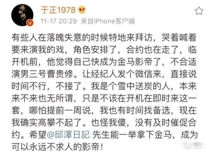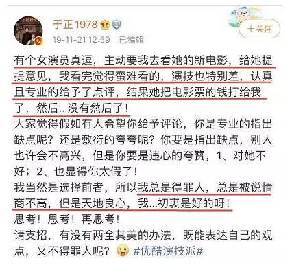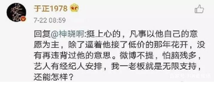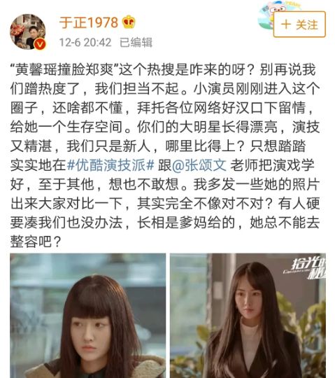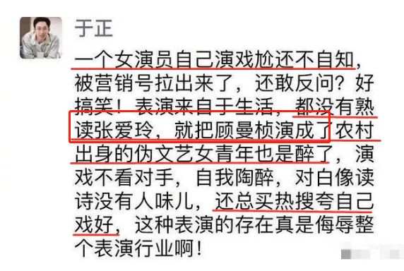 前两天,张檬恋情被扒,于妈又写了一篇小作文《茉莉》,怎么看都是和张檬联合洗白+炒作。 果不其然,热搜后,于正新戏猝不及防官宣定档。 靠着抄袭还能在娱乐圈混得风生水起,于妈是有几把刷子的。对旗下艺人,一方面真的护犊子,另一方面真的招黑,让粉丝又爱又恨。 在《宫2》播出时,袁姗姗正是被拿来跟杨幂比较时,于正表示袁姗姗比较像孙俪,是清新大气的稀缺花旦脸。 还说袁姗姗不演配角,不客串戏,只做女一。当年的范冰冰是怎么样的,现在的袁姗姗就是怎么样的。闭眼吹抬高演员身价,妥妥给袁姗姗招了一波黑。 《延禧攻略》吴谨言大火的时候,于正夸赞:她太漂亮了,所以我把她眉毛剃了,她是魏璎珞的首选,我没有考虑过任何其他人。太漂亮所以把眉毛剃了? 华鼎奖给魏璎珞颁奖,于妈很激动,说:“我这一生会捧出一个时代的巨星,这是我来这个世上的责任”…… 为了维护吴谨言,还和陈晓的粉丝开撕。称自己拼尽全力把一个素人变成明星,改变了陈晓的命运,甚至四亿投资的女主都按照他喜欢的标准来找,还逼迫陈晓接下嫌弃报酬低的《那年花开月正圆》。 而且气不过的于正还晒出了聊天记录,现在做的不就是在坑陈晓吗? 对于新人,于正自有“强捧法”。喜欢贴着别人炒作,俗称拉踩,不点名半点名的拖人下水,宣传他的作品和新人。 有次于正说自己新写了一个故事《缘》,要拍成剧,男女主都是明星,二人因戏生情,结果女主越来越红,男的却停在了原地,二人最后各自结婚,但是男主还爱着女主。 于正说这个故事是真的,吃瓜网友都在猜是赵丽颖和陈晓。于妈自己也很会,他曾经用“燃”形容过赵丽颖,所以应该是颖晓CP没跑了。 在舆论发酵的差不多的时候,于正又发文回应称“写的时候没想到那二位”,解释取材的真实故事不是大家猜测的那样。秒删之后,再来个是网友脑洞太大,牵强附会的解释。最重要的是,还不忘圈出来自家艺人的微博ID,为了捧新人,于妈也太煞费苦心了。 上了热搜之后,赵丽颖陈晓俩人抬桥,营销号配图全是于正自己手下要捧这位女演员张南,于正真是个妙人。 还有一次,于正曝旗下一个38线开外的艺人被前女友恐吓,前女友扬言:“不复合就要搞死他”,这位艺人很快被扒出来叫赵弈钦。 于正后来又晒出了赵弈钦给前女友的转账记录,还搜集到一些女方放贷等黑料,中途还和疑似该女生的微博互怼。 最后这件事不了了之,但最终的结果是,这位38线艺人赵弈钦借着热搜混了个脸熟。 自家艺人撞脸郑爽上了热搜,不仅趁机安利一波,还内涵郑爽整容。 于正的自我修养就是蹭热度,疯狂给自己加戏。李嘉欣来参演于正的作品,本来大美人出演,大家都会夸一波,结果被于正各种拉踩+咖位*100一波骚操作,搞的大家都去嘲李嘉欣。屈楚萧事件发酵之时,于正一副苦口婆心侃侃而谈的姿态,#于正要求演员参加剧本围读# 还上热搜。 然后于正晒出第一次剧本围读的图片,原来也是为新剧预热炒作啊。 在金马奖颁奖典礼进行时,于正大爆和邱泽的往事,说自己雪中送炭,邱泽忘恩负义,顺势拿下热搜第一。 马思纯演技被嘲,于正又自曝某女演员要他看自己的新戏,他看完后指出女演员演技烂,女演员气得把电影票钱退给他,就再没有然后了。 之后他朋友圈截图也流出,这说的就是马思纯啊。 但热搜后于妈又又又不认账了,说跟你们想的那个人无关,不愿意连累无辜的人。 还有一次,宁静怒怼某演员上了一波热搜。在这么大的一个乌龙事件里,忙的又是评论又是发博的于正,跳的那叫一个欢,让不少无辜的明星卷入其中。 到头来于正一句“我把事情说清楚”就完事了,还摆出一副正义凛然的样子表示自己不炒作,怪吃瓜群众唯恐天下不乱,可全程嘴最碎的不就是戏精您本人嘛? 到头来不就是想让人知道,于正签下了宁静嘛。 《凤囚凰》的时候说要用米热,之后没选上,又发了和朱一龙的照片,说他可能会是主角,最后主角是宋威龙。 不叫张萌叫耀客老板娘,不叫江一燕叫蛋糕店老板娘。 总的来说,在于妈的娱乐圈生涯中,吃什么都行就是不能吃亏,什么都能放过就是不能放过每一个可以蹭的热度。作为一个编剧,简直比二三线明星还能折腾。 于妈能抄袭、碰瓷、瞎编,最大的本事还是炒作,炒得前无古人,后无来者,就不能踏踏实实的做编剧吗?当然这是不可能的,八卦可能会迟到,但于正不会。 |