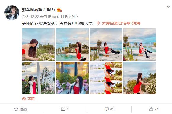 要说起国内初代网红,因高调炫富全网走红的郭美美,绝对占据一席之地。只可惜她当年年少无知,被金钱欲望冲昏头脑,最后因涉嫌开设赌场罪被判入狱,坐了整整五年的牢。 如今,郭美美早已刑满释放出狱,洗心革面,自力更生,为了自己的事业努力打拼。疫情期间,郭美美因发文力挺韩红做慈善,彻底改变了自己在公众心中不好的印象,获得了一致的好评与认可。  26日,郭美美通过微博晒出了一组美照,并定位大理洱海,正享受着当地如天境般的美景,体验入住了很有诗情画意的花瓣海客栈。  从郭美美所晒照片来看,容貌相比之前又有了明显的变化,尤其是鼻子经过整容微调之后,变得更加立体坚挺,以前的那种不自然的感觉,彻底消失不见。 但唯一不变的就是,郭美美傲人火辣的身材,依旧保持地非常完美惹眼,一身红色吊带露背超短裙,穿在她身上特别的合适好看。  不难看出,郭美美跟所有女孩子一样,对娇嫩欲滴的花朵,毫无抵抗力可言。 在美丽的花丛中间,凹着各种造型,变着各种姿势,只为呈现出自己与花朵最美的效果。  与此同时,花映衬人,人烘托花,郭美美白皙的皮肤,水润的脸颊,宛如自然界当中最娇艳的“花朵”。  看到郭美美晒美照,不少粉丝迫不及待想要见到真人,于是便在评论区里头表白,提问郭美美何时能够举办粉丝见面会。 对此,郭美美在第一时间回复了粉丝的提问,表示有机会一定会举办粉丝见面会。