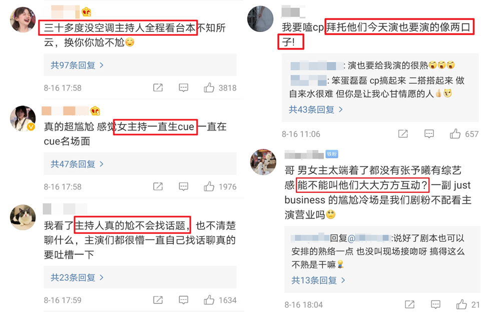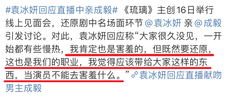 编辑:Joo 说到最近的热播剧,除开《以家人之名》,就属《琉璃》了吧? 一边是不少观众化身自来水,埋怨剧方的宣发太糟糕; 另一边则吐槽着主角颜值,表示连点开正片的兴趣都没有。 “激烈交火”之下,这部剧却因“直播吻戏”出圈了↓ 男主角成毅,女主角袁冰妍。 在剧作直播见面会,为营业直接亲上了脸。 大多人第一次看,可能都是这张“错位kiss图”, 自然也引发了程度不同但想法一致的吐槽: 为了红是炒作疯了吗? 过了一会,剧迷的解释终于上线: 这不过是应导演要求,还原剧中名场面。 在现下经常是“要骂就骂我爱豆”的调侃之中, 剧粉这回的态度倒是如出一辙: 要怪就怪我们吧,这是我们求来的。 只因为男女主角之前很少营业—— 在见面会之前,主创也参加了一个抖音直播,两人连对视都很少,更别提互动,在主持人一味强调名场面、却未做好功课的掺和之下,尴尬得就像两家一起相亲却发现相亲对象是前男友,满脸都写着just business。 剧粉除了吐槽主持之外,也不忘劝告主演要营业。 如此这般,之后的直播也推迟了。 大约是公司进行了沟通? 接下来,除了还原名场面的亲脸戏,两位当事人反复强调剧组氛围很融洽,两个人真的很熟。 肉眼可见的努力,自然让观众开心了。 今天,当事人也站出来回应: 这也是我们的职业,当演员不能去害羞什么。 即便如此,行为本身依旧逃不过教育—— 从恃糊行凶,放在流量身上绝对会被骂惨,
