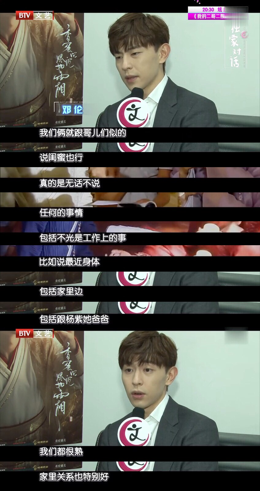 都值得吐槽一番。 在这套话语体系之下—— 单方面营业就叫倒贴蹭热度的502胶水, 单方面不营业才是高贵冷艳、独自美丽的理想演员。 比如18年的杨紫和邓伦, 两人都靠《香蜜沉沉烬如霜》实现人气暴涨, 剧中便是一对痴缠三世、守望千年之恋的眷侣, 剧外也是认识多年的老朋友, 杨紫推荐邓伦出演,邓伦交出了高分答卷, 邓伦夸杨紫是开心果,享受被调侃的感觉, 两人无话不说,家里关系都很好, 翻看当时拍摄的花絮,你在闹我在笑,一片欢乐。
