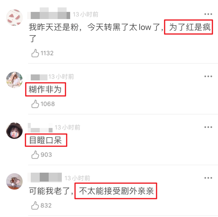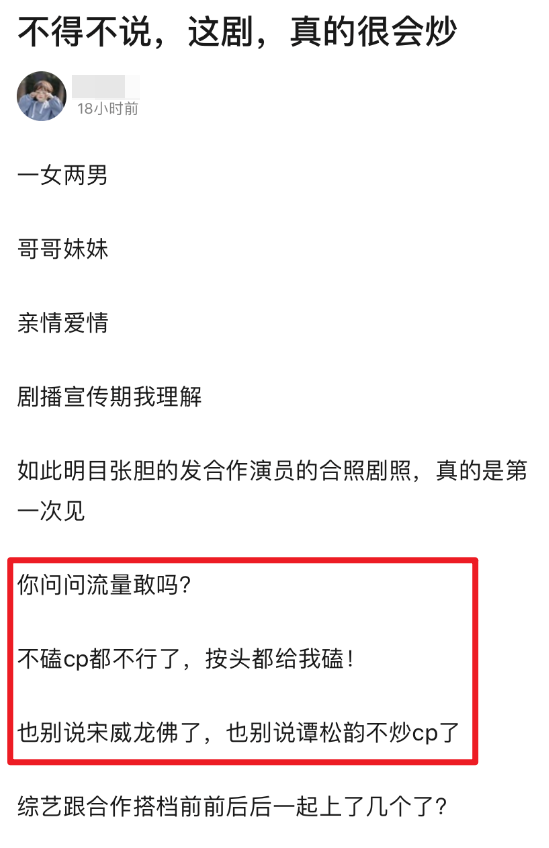 到贷款嘲弄,主演绝对会为了提纯粉丝而开撕, 橘并不觉得意外。 当然是因为这样的逻辑太常见,早已脱敏。 “营业过度”成了一个框,被嘲不再是个别现象。 只说最近几个月,受质疑的就不是一两个—— 《清平乐》开播前期, 江疏影换上了“帝后”情侣头像, 还发出自己追剧并磕CP上瘾的微博… 你看,是同款逻辑吧?
