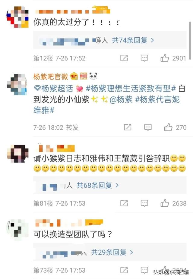 图源@佟年鱿小鱼 上月末杨紫工作室又发了复制粘贴的白裙造型, 评论区粉丝一水儿在骂人。 加上出席活动积攒下的种种矛盾,造型师被送上了热搜。 粉丝质疑造型师每次活动给杨紫的,都是万年不变的形象,难道只拿钱不办事,要求换人。 不过另外一种声音则是反对集火造型师,主要观点包括,杨紫造型换得少是因为没得选,本人的身材不够好,为难造型师也白搭。 这一观点的依据主要是在于,杨紫的体重在路透中一直起伏颇大,时而不胖,时而胖胖。(可能与私 服也有关系) 以至于支持与反对的声音,彼此都很难说服对方。 当然了,即使是作为艺人,外形也免不了有短板,这种时候就需要好的造型师扬长避短化腐朽为神奇,在其位谋其政嘛。 不管什么先天条件都能打造得美美的,才可以看出功底啊,比如美妆界的换头大师毛戈平~ 说不定还能造福下围观群众,开启一条新的时尚icon之路。 至于服装品牌找人带货,要想真的增加销量,真的该在出镜造型上多下点功夫,乱搭一气很可能起到反作用啊。 就像大家看到最前面的几张图,有心动吗?