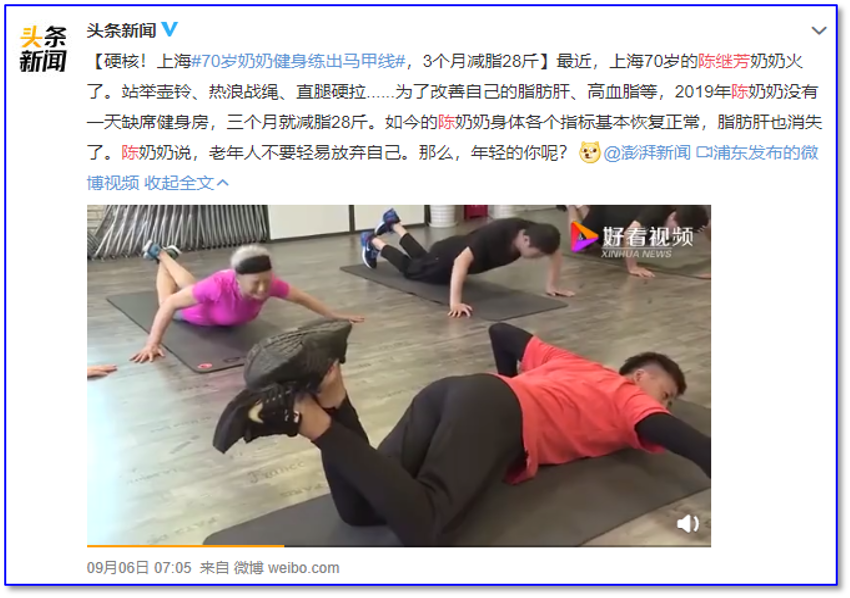 不被年龄定义,活得年轻 青春已逝、红颜不再意味着什么呢? 有人这样形容: “就像颗菜一样被人去挑选,然后嫌你这个菜叶子老了,嫌你这个日期不新鲜了。” 读来令人震惊。 但如果不惧怕年龄,而是在它的框架之外生活,那就是另外一回事了。 最近,“70岁奶奶健身练出马甲线”的新闻,被很多人点赞。 奶奶叫陈继芳。为了改善体质,她不顾高龄,把自己“杠”进健身房。站举壶铃、热浪战绳、直腿硬拉等等,样样玩得认真又专业。 3个月之后,成绩喜人,脂肪减掉28斤,并且身体各项指标基本恢复正常。 所以,在央视《越战越勇》的舞台上,她借助健腹轮锻炼体能的片段,引发一片尖叫。 看着奶奶的马甲线,网友们在点赞之余,都自愧不如:“我身体都没她好。” 还有网友发出疑问: “真的70岁吗?说她50岁我也信。” 确实,如此好的精神和体态,哪里像是70岁的老人家? 无独有偶,像陈继芳奶奶这样“逆龄生长”的人,不止一个。 武汉83岁的康康爷爷,不仅着装时尚,还非常热衷打篮球、健身,状态可比年轻人。 日本新晋网红——92岁的西本喜美子老奶奶,70岁学摄影,如今不仅绘图软件、修图软件运用娴熟,还非常幽默地拍摄创意照片,来讽刺某些社会现象。 可以说,她的情怀和责任感,不输任何年轻人。